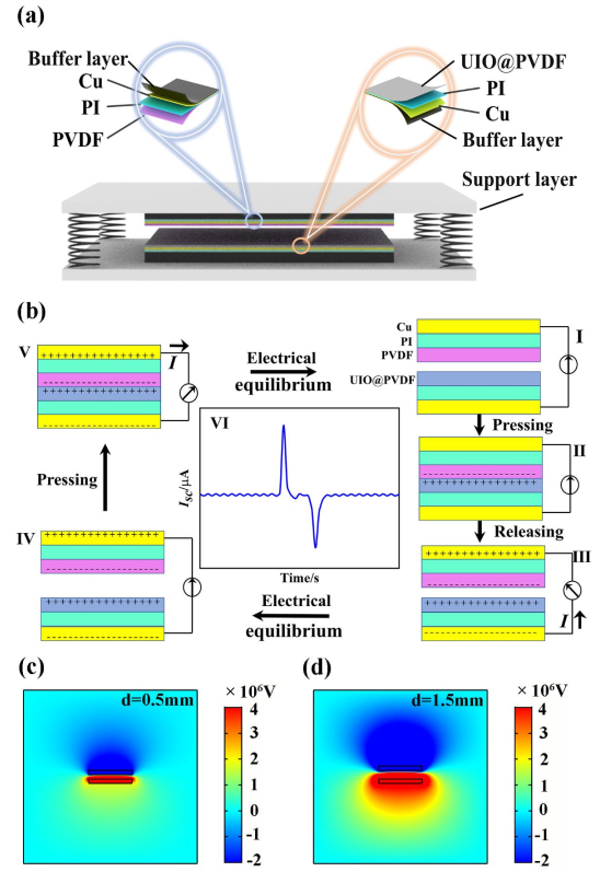 文中采用UIO-66、UIO-66-NO2和UIO-66-NH2系列材料构建了新型高效摩擦纳米发电机,其中-硝基(-NO2)和氨基(-NH2)的引入显著改变了材料的费米能级,使摩擦纳米发电机的两极板在接触过程中能够产生和转移更多电子,其中基于UIO-66-NH2的UNH2-TENG (15wt%)的电流输出性能优异,最大短路电流(Isc)达50.0 μA,开路电压(Voc)达210V,最大功率密度达122.5 μW·cm-2。