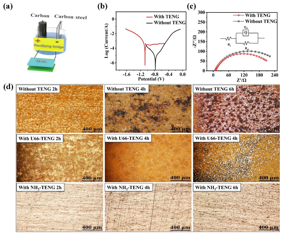 Figure 2 Schematic diagram for cathodic protection through electrochemical activity. (a) Cathodic protection system. (b) Tafel curves for carbon steel recorded with setup in the absence and presence of TENG. (c) EIS profiles for carbon steel and equivalent circuit diagrams for connected and disconnected TENG. (d) Corrosion response of carbon steel connected to different versions of TENG.