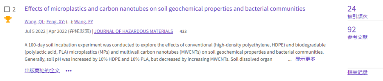 (1)论文1发表于环境类top期刊《Resources, Conservation & Recycling》(https://doi.org/10.1016/j.resconrec.2022.106503),累计被引22次。该文系统评述了微塑料在陆地植物中的吸收、转运和植物毒性,并探讨了当前研究的不足,指明未来需要优先研究的方向。