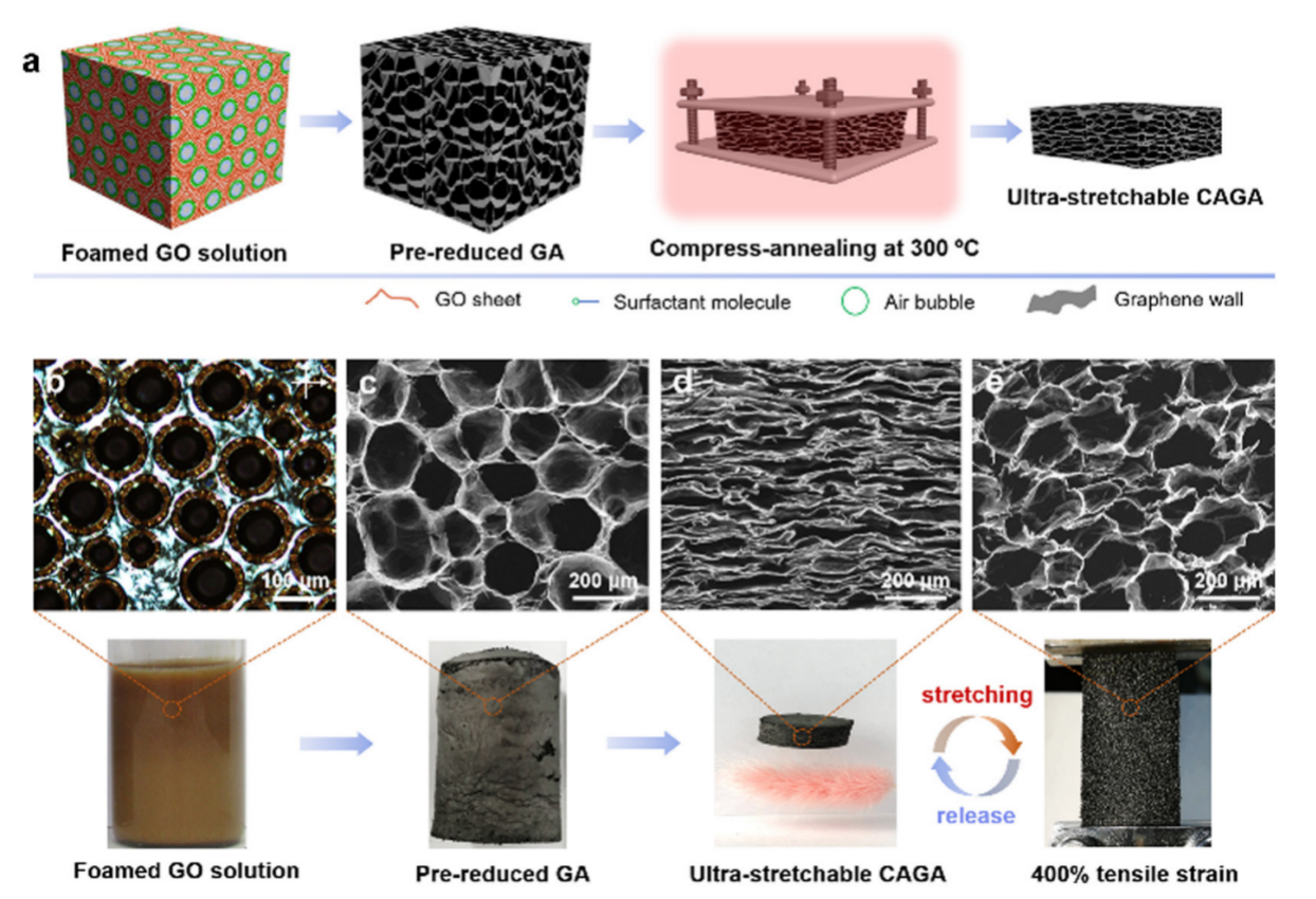 众所周知,高卷曲的高分子交联网络赋予了聚合物超高的拉伸弹性。然而,利用陶瓷或碳材料等无机材料来构建上述结构并实现这种拉伸性能是非常具有挑战性的。这项工作中,通过简单的两步方法,开发了具有高度卷曲交联网络的超拉伸石墨烯气凝胶,实现了前所未有的-95%到400%的可逆伸长率。首先,通过气泡模板辅助方法组装直径为数百微米的交联球形石墨烯纳米壳。然后,采用压缩-退火法对球形纳米壳进行进一步的卷曲和固定。皱缩的石墨烯结构虽然可以固定,但高温退火后由于高压缩产生的许多新界面也会被焊接,就像橡胶过度交联一样,拉伸弹性很差。通过对石墨烯表面含氧基团和卷曲度的精确控制,很好地解决了这一矛盾。结果表明,当退火温度为300℃,预应变为80%时,石墨烯纳米壳形成强面内相互作用和弱界面相互作用,使高度卷曲的结构不仅可以被固定,而且可以通过拉伸重新回到球形状态。通过有限元模拟,确定了压缩和拉伸过程的变形机理。制备的超高拉伸弹性石墨烯气凝胶在-196.5℃至300℃范围内表现出类似橡胶的优异弹性。这种泊松比接近于零的导电气凝胶具有典型的低应变高灵敏度(< 50%)和大应变下特有的超低灵敏度(50% ~ 400%)。结果表明,这种新型可拉伸导电材料,可作为稳定的超可拉伸导体应用于极端低温环境,在航天探测领域具有极好的应用前景。