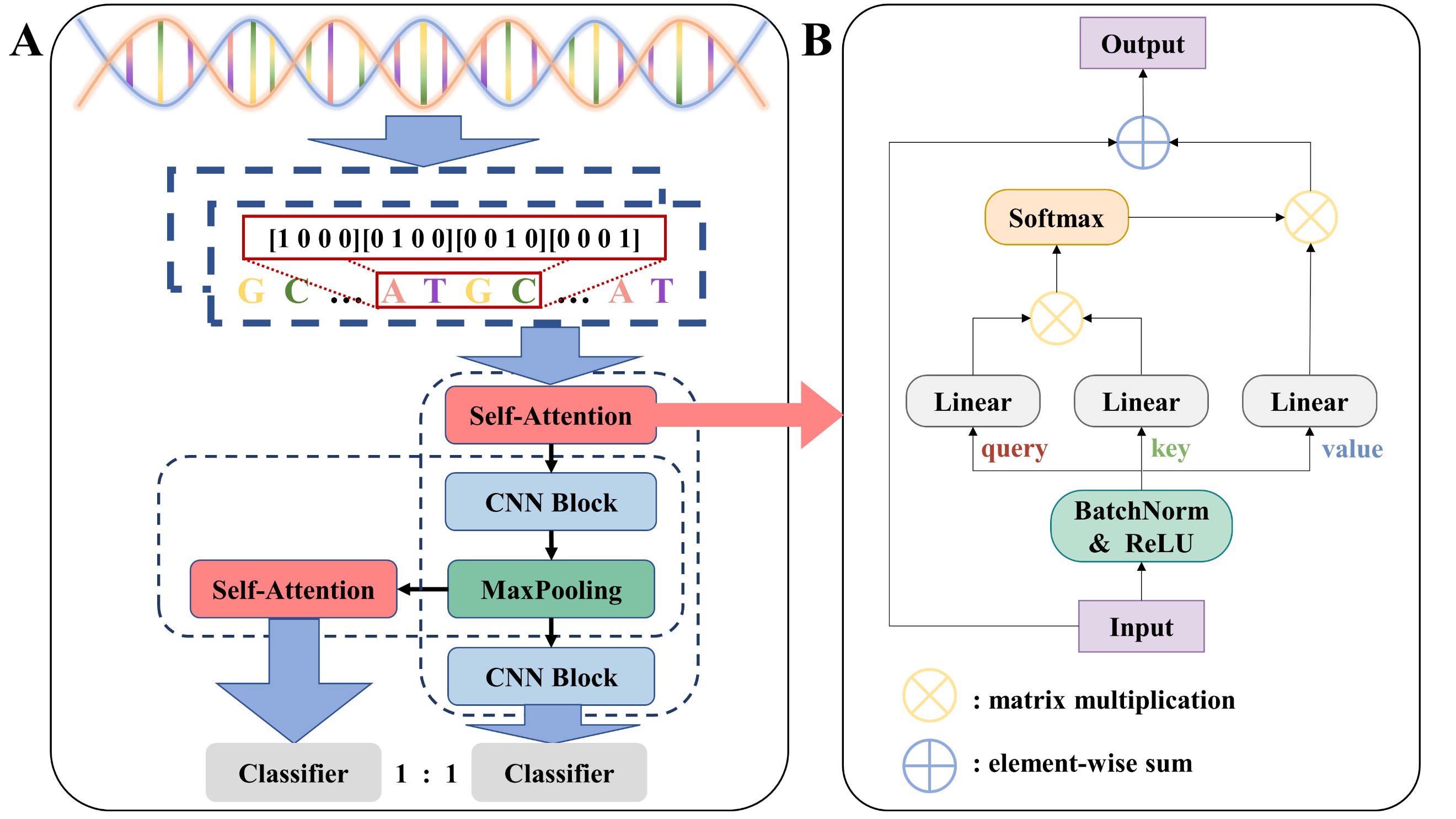 本研究首次提出一种新颖的双分支结构,将卷积神经网络与自注意力机制结合到转录因子结合位点的预测。自注意力机制能够加权处理输入序列中不同位置的信息,提高长距离依赖关系的建模能力,有助于检索具有序列特征的转录因子结合位点。卷积神经网络能够对输入数据进行局部特征提取,并且具有平移不变性,对于输入数据的轻微变化能够保持相对稳定的输出结果,从而在基因组序列数据的噪声和变异处理方面具有高效性。本研究提出的模型DSAC将两者有效的结合在双分支框架中,并且采用1:1的权重比,结合全局信息和局部特征,使得其在与其它深度学习的先进模型对比中突显出更强的特征提取能力与更优异的泛化性,以此来达到更好的预测效果。本文提出的DSAC深度学习模型能够成为生物信息学的有效工具,为揭示基因调控机制、研究疾病发生机制以及处理大规模基因组数据等方面做出贡献。