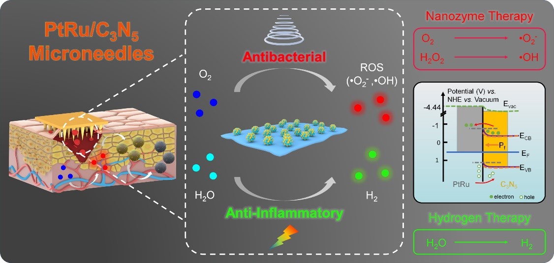 beat365官网材料学院朱之灵和隋凝团队长期致力于新型纳米药物递送体系的开发。近日,在《Advanced Functional Material》(中科院一区TOP期刊,影响因子19.924)发表研究论文“Piezo-Augmented and Photocatalytic Nanozyme Integrated Microneedles for Antibacterial and Anti-Inflammatory Combination Therapy”。该论文报道了一种铂钌纳米合金修饰的石墨相氮化碳C3N5纳米片(PtRu/C3N5)集成微针用于抗菌抗炎联合治疗。这种杂化纳米酶治疗剂被整合到天然透明质酸微针中,其在10分钟的超声处理内在体外和体内对多种细菌菌株表现出几乎100%的广谱抗菌功效,并在1小时可见光照射后有效抑制炎症反应。这项工作提出了一种富有前景的一体化的抗菌和抗炎治疗新策略,同时为纳米酶药物递送体系的开发提供了新思路。材料学院研究生史树高为第一作者,隋凝副教授、朱之灵副教授为共同通讯作者,beat365官网为第一通讯单位。