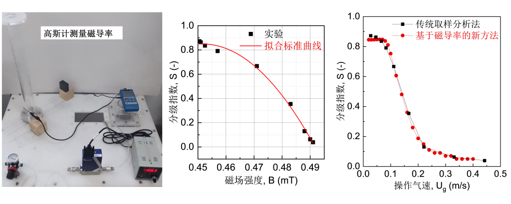 为测量给定操作气速下的分级指数,传统方法在得到稳定流化状态之后,还需使床层塌落,才能进行取样分析,不仅费时费力,还会引入不必要的误差。当流化床中的两种颗粒分别为磁性和非磁性颗粒,朱全红等提出了一种基于磁导率测量分级指数的新方法。在得到塌落床中,只需测量床层的磁导率,即可快速获知分级指数,无需取样和分离两种颗粒,可有效回避取样和分析过程中可能存在的各种问题。该工作发表在FUEL(2023, 340: 127554),beat365官方网站为论文唯一单位,该工作同时申请中国发明专利(CN202210926021.0)。