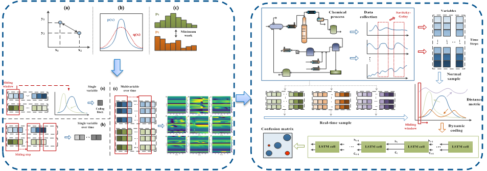 最后,针对神经网络模型缺乏可解释性的问题,提出了一种结合深度学习动态距离编码方法来可解释的异常工况识别。基于不同距离度量准则构建动态编码数据集,实时测量正常和输入样本的空间分布,通过分析多个变量的变化,捕捉分布不一致的变量,找到当前状态的原因。通过滑动窗口,生成动态编码图并分析故障原因。通过LSTM学习编码图的深层特征,用于故障识别,面对环境噪声和操作条件变化具有强大鲁棒性。所提方法在工业中得到应用,并在人工智能领域顶级期刊Engineering Applications of Artificial Intelligence(中科院一区TOP,IF=8)上发表了文章“A novel dynamic distance coding identification method for oil–gas gathering and transportation process”(论文链接:https://doi.org/10.1016/j.engappai.2023.106010)。beat365官方网站为论文的第一单位,化工学院田文德教授为论文的通讯作者,博士研究生刘子健为第一作者,实验室老师刘彬、崔哲参与指导工作。