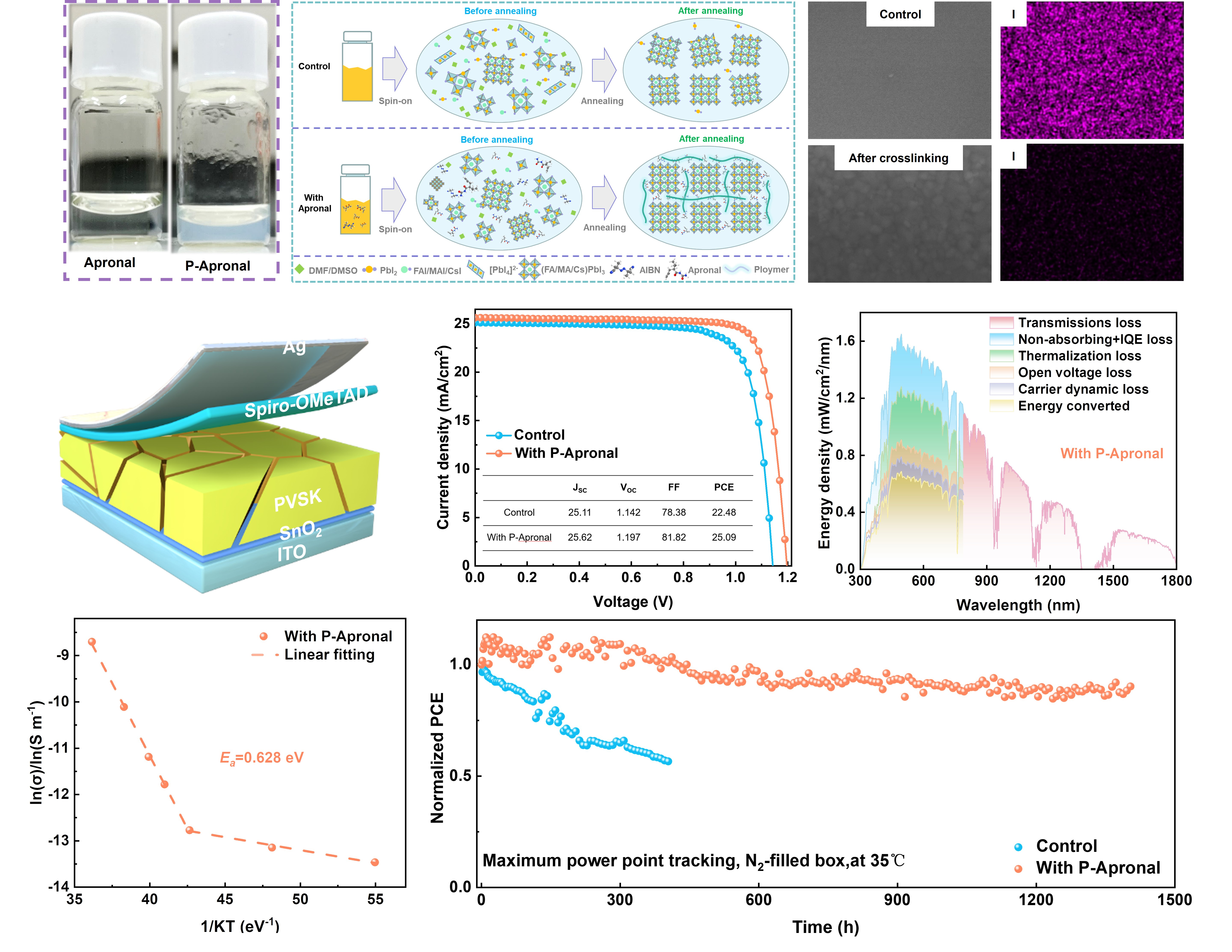 周忠敏团队于2023年10月25日在国际知名期刊Angewandte Chemie上发表题为“Inhibiting Ion Migration Through Chemical Polymerization and Chemical Chelation Toward Stable Perovskite Solar Cells ”的文章。引入可聚合分子N-氨基甲酰基-2-丙-2-基戊-4-烯酰胺(Apronal)。在高温和交联引发剂的作用下,Apronal通过末端碳碳双键完全化学交联,在钙钛矿晶界(GBs)和薄膜表面形成一个强大的聚合物网络(P-Apronal)。通过氢键和配位相互作用的结合锚定有机成分抑制了离子迁移和钝化Pb和I相关缺陷。因此,钙钛矿太阳能电池的存储稳定性、热稳定性和操作稳定性都显著提高。