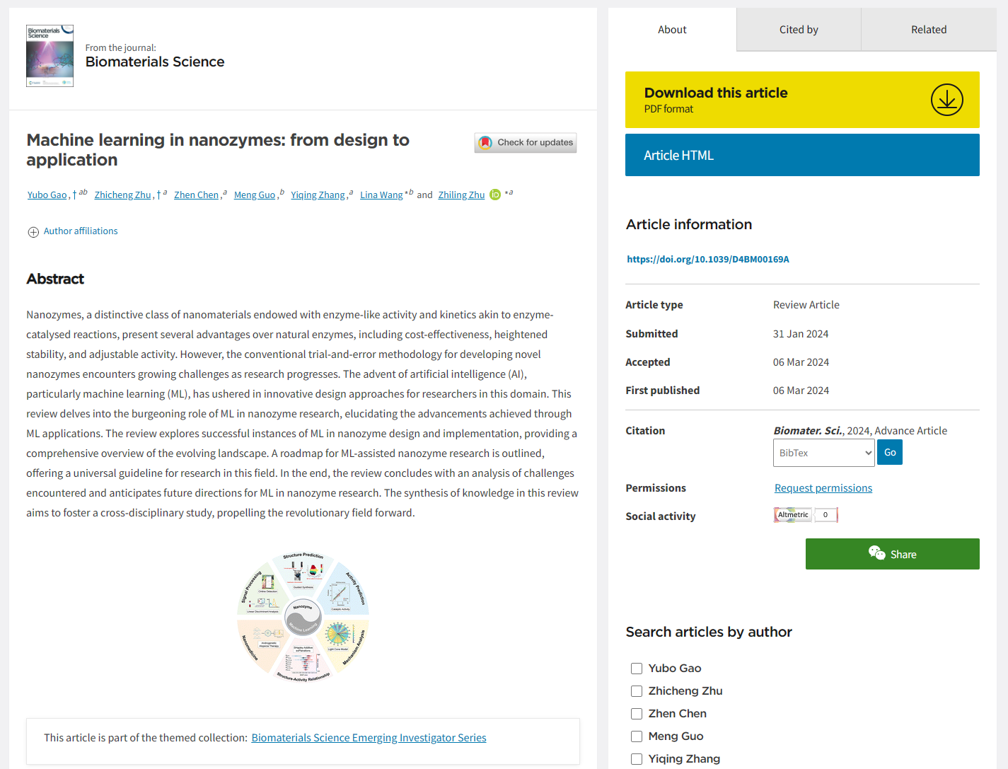 近日,beat365官网材料学院朱之灵副教授受邀在英国皇家化学会期刊《Biomaterials Science》新锐科学家系列(Emerging Investigator Series)发表了一篇题为“Machine learning in nanozymes: from design to application”的综述文章。该系列旨在展示新锐科学家正在进行的工作。这一系列汇集了生物材料科学家在其独立职业早期所做的最优秀的工作,以此表彰他们在引领未来科研领域创新方面所展现出的巨大潜力与深远影响。