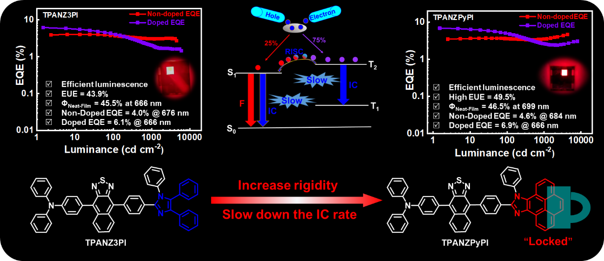 团队成员围绕这一关键问题,在高荧光量子效率的纯有机深红/近红外材料和OLED器件方面取得新进展。团队成员首次提出了抑制第一单线态激发态(S1)到基态(S0)的内转换(IC)过程提高深红/近红外材料荧光量子效率的思想,通过设计合成具有不同刚性程度的D-A-D型有机深红/近红外分子(TPANZ3PI和TPANZPyPI),系统地研究了分子结构特点对有机深红/近红外分子的光物理性质、热性质、电性质及非掺杂OLED器件性能等方面的影响。研究发现:具有相对更大刚性的TPANZPyPI分子可以实现更高的PLQY和更高的激子利用率及OLED器件性能。制备的非掺杂OLED器件的电致发光峰位分别为676和684nm,属于深红光/近红外发射范围。其中,基于TPANZPyPI制备的掺杂和非掺杂OLED器件外量子效率分别达到了6.9%@666 nm和4.6%@684 nm,是目前外量子效率最高的纯有机深红/近红外发射的热激子OLED器件性能之一。这项工作,从理论和实验相结合的角度证明了增加分子刚性除了能抑制S1到S0的内转换过程,实现高PLQY之外,还能抑制三线态激发态之间的内转换过程,从而实现高效电致发光。这种设计方法将为未来实现高效深红/近红外有机荧光材料体系的发展提供新的设计思路,同时也展示出其在OLED应用领域的巨大价值。