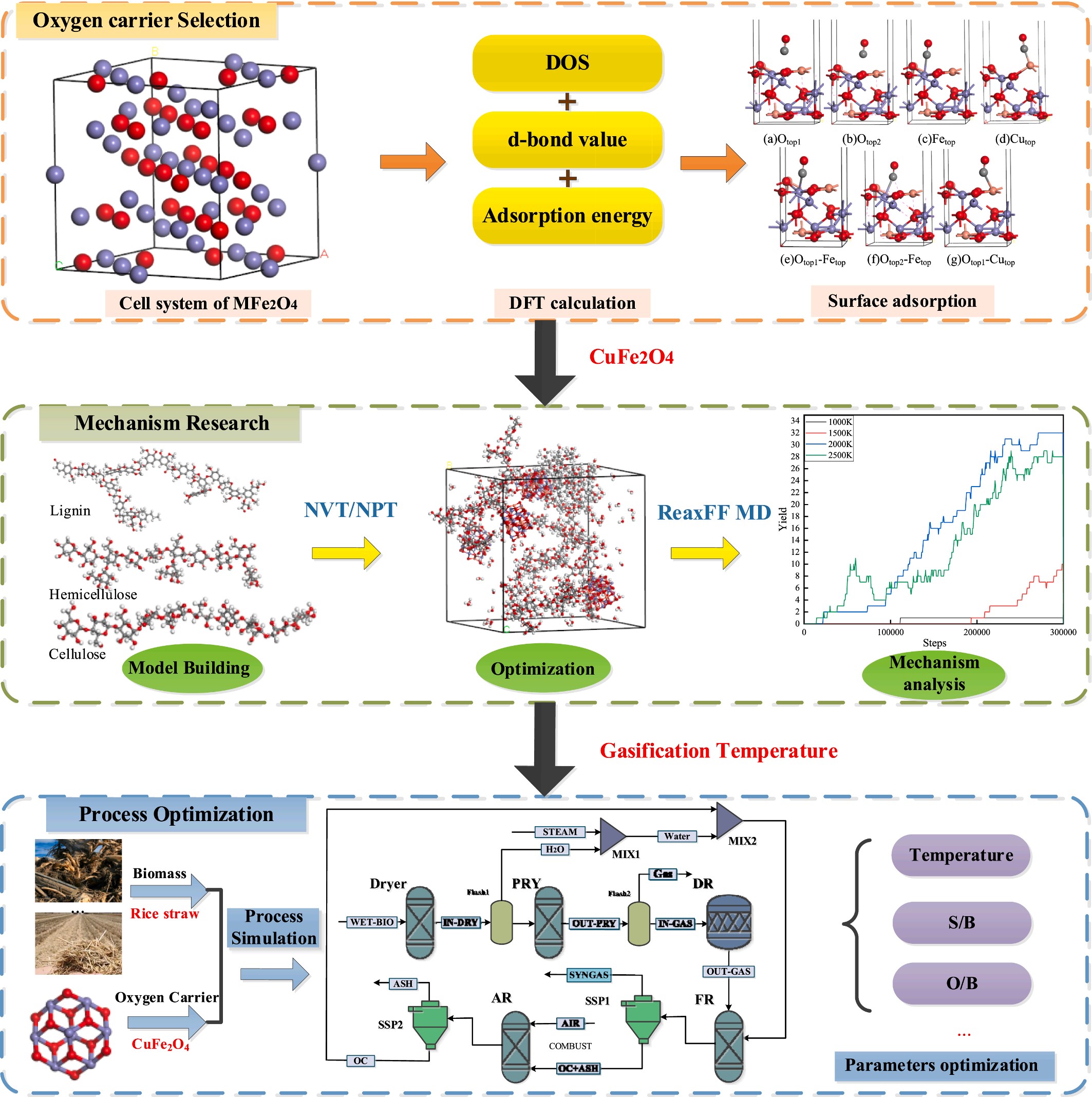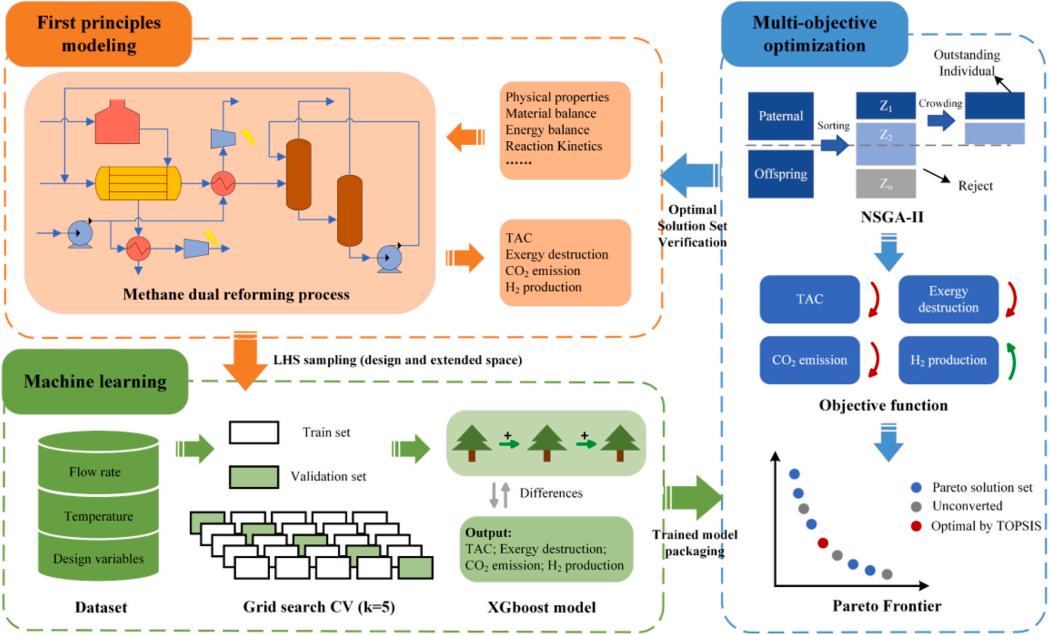 文章分别提出了基于复合载氧体选择的生物质化学链气化过程多尺度优化策略(如图1)、基于机器学习代理模型构建的甲醇重整过程多目标优化策略(如图2)、基于流程建模与智能筛选的煤焦油化学链气化动态优化控制策略、基于动态模拟与深度学习的煤制乙二醇过程废水智能溯源策略及基于流体力学建模的火炬气回收工艺优化设计策略。采用分子模拟与流程模拟、理论计算与实验测试的多尺度、多策略的新型融合式研究手段,旨在实现复杂化工过程的平稳高效运行。以上5篇文章均以beat365官方网站为第一单位,田文德教授、刘彬讲师分别为论文的通讯作者,崔哲副教授、博士研究生刘子健、博士研究生李哲、硕士研究生孙阳、硕士研究生范晓敏分别为论文的第一作者。