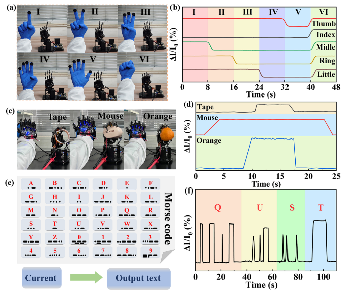 图3(a)手与机械手的同步运动;(b)传感器对(a)中手势的响应;(c)机械手握住不同物体的照片和(d)信号图:胶带、鼠标、橙子;(e)莫尔斯电码表;(f)输出“QUST”的摩尔斯电码信号图。