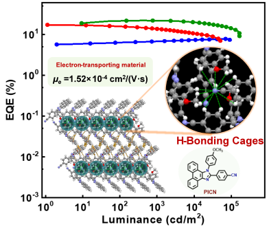 基于此,该团队设计并合成了两种新型电子传输材料(PICN和PINH),以具有丰富C-H···π相互作用的菲并咪唑为骨架,通过引入不同性质的侧基,有效地调整了两种材料的分子排列方式。单晶结构表明,PICN的多分子间形成了以N原子为圆心,C-H···N为半径的“氢键笼”结构。这种结构是长程有序的,它有效地拉近了多维空间中分子间的距离,使分子间获得了更为紧密的堆积模式,表现出更高的电子迁移率(1.52×10-4cm2/(V·s))。进一步以PICN作为电子传输层应用到了蓝光FOLED、绿光和红光PhOLEDs全色器件中,实现了7.7%、17.1%和21.9%的最大外量子效率(EQEmax)和1000 cd/cm2亮度下330 h、630 h和630 h的器件寿命(未封装条件下)。更重要的是,该结果优于已商业化使用的经典ETM-TPBi为传输层的器件,尤其是器件高亮度下的寿命,是TPBi基器件的4-20倍,展现出PICN具有巨大的应用潜力。这一成果提出了一种新型的“氢键笼”结构提高电子迁移率的分子设计思想,为实现高效和稳定性OLED提供了新分子结构和可行新策略。