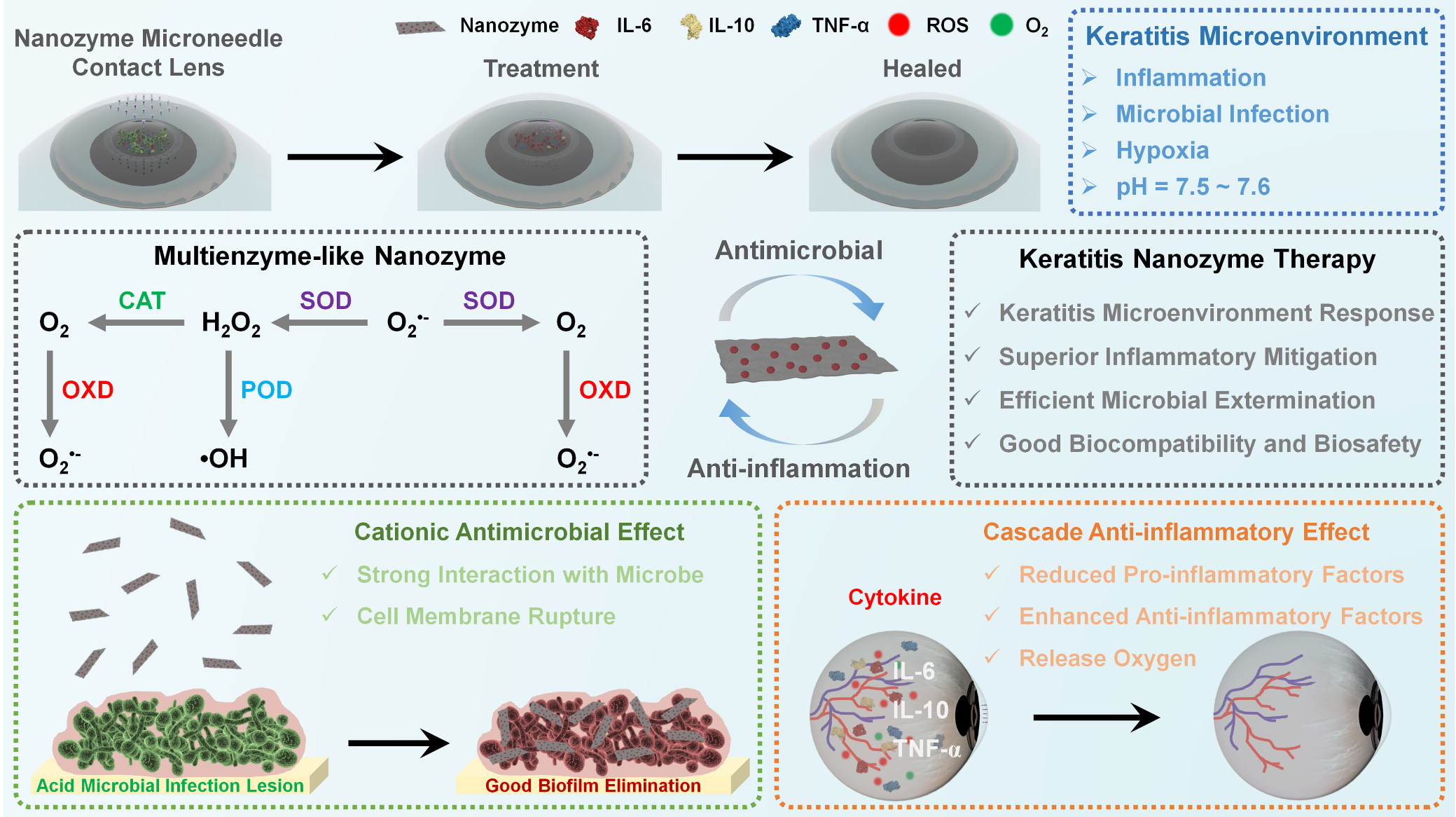 图2.装载多酶活性纳米酶的眼用微针用于治疗传染性角膜炎的治疗原理图