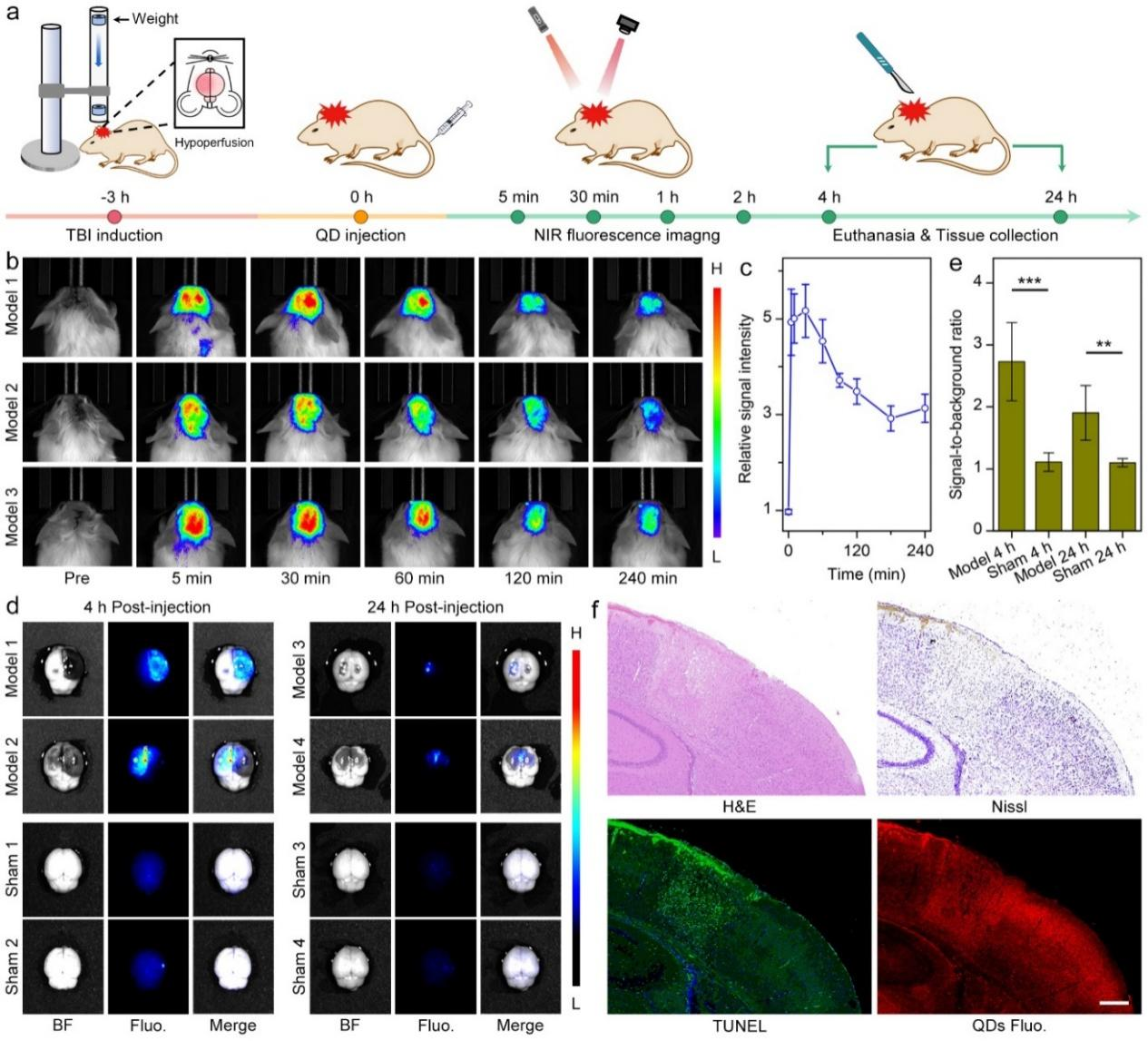 为解决这一临床挑战,本研究提出了一种基于近红外量子点荧光成像的综合诊断和管理模式。这种创新策略能够全面评估TBI的严重程度,帮助选择最佳的治疗策略,并提供实时的术中和术后指导。它能区分颅内和浅表出血、检测继发性脑损伤,并在血肿引流手术中提供术中指导。该成像模式有望显著提高治疗方案的准确性,改善TBI患者的临床预后(图1)。