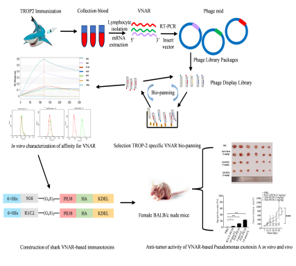 免疫毒素是一类基于抗体的新型抗肿瘤药物,由于其肿瘤杀伤的高靶向性和高毒性,也被称为“生物导弹”。TROP-2是一种肿瘤相关抗原,在多种实体瘤中高表达,是一个理想的免疫毒素药物开发靶点。与经典抗体相比,来源于鲨鱼的纳米抗体具有分子量小、稳定性强、亲和力高、组织穿透性强、易于识别隐藏抗原和制备成本低等优点,在免疫毒素药物开发中具有独特优势。本研究以TROP-2为靶点,利用噬菌体展示技术从鲨鱼外周血淋巴细胞中分离得到了一个亲和力高、特异性强且识别全新抗原表位的鲨鱼纳米抗体5G8。通过与毒素蛋白PE38融合表达,利用大肠杆菌表达系统制备了免疫毒素5G8-PE38,该免疫毒素在三阴性乳腺癌模型中表现出良好的抗肿瘤活性和生物安全性,具有药物开发潜力。