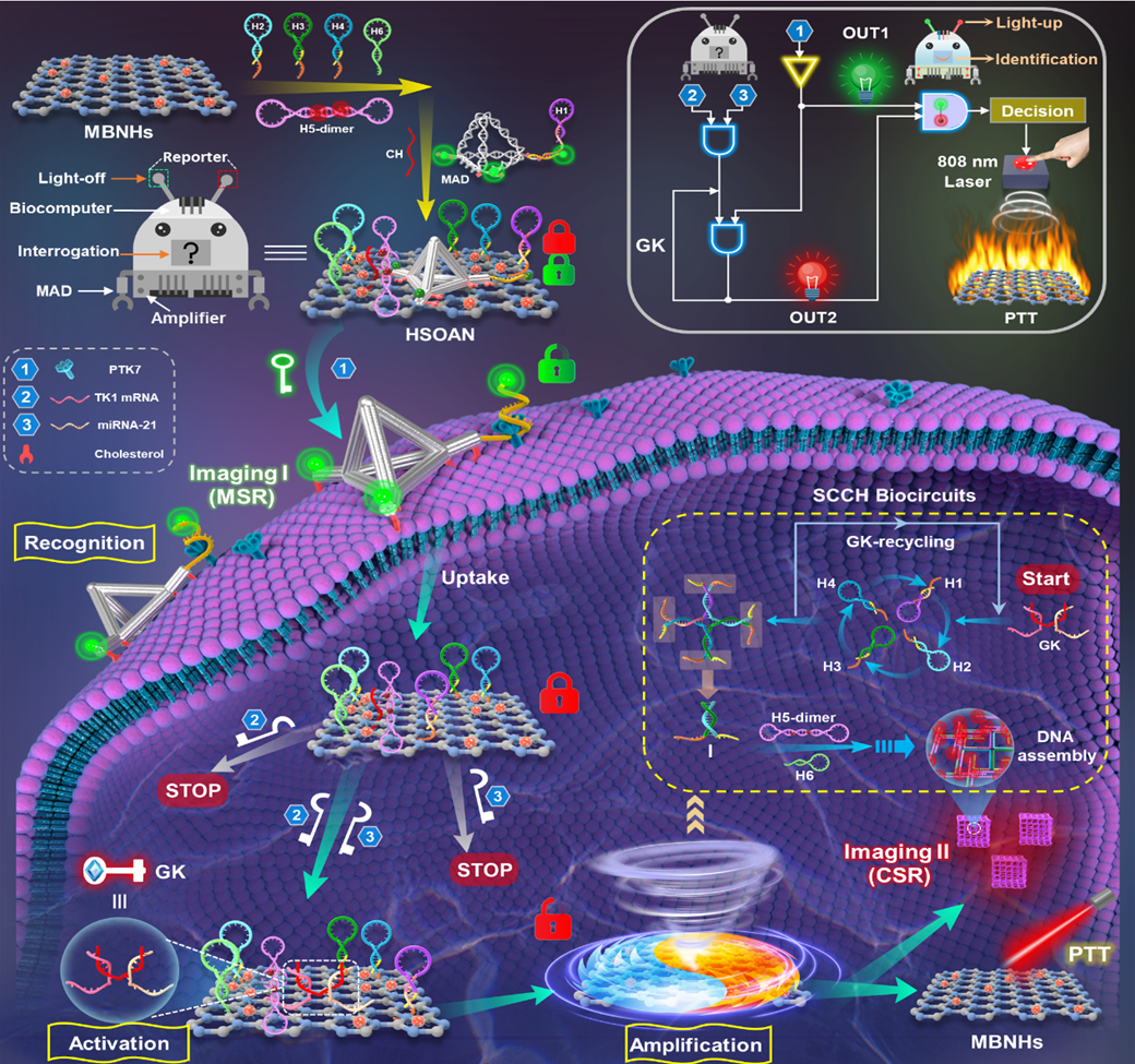 面对这些问题,beat365官方网站化学院周宏教授、何鹏副教授团队在Chemical Engineering Journal(IF=13.3)发表了题为“Intelligent Operation-Activated Dual Light-Up Nanointerrogator for On-Site High-Performance Bioimaging”的研究。团队开发了一种智能“分层扫描-运算-自动反馈”纳米询问器(HSOAN),用于精确的细胞识别和个性化光疗。将“生物计算机”与“电路放大器”有效结合,并选择多种生物标志物作为计算输入,基于“YES-ANDI-ANDII”逻辑门顺序感应膜蛋白 PTK7 和细胞质 TK1 mRNA 和 microRNA-21 基因。经历自上而下的扫描-识别,纳米询问器仅在具有三位生物编码的靶细胞中实现空间特异性双色信号输出。研究表明“双锁-三钥匙-双报告器”控制的纳米询问器提高了细胞识别的准确性。工程化框架支撑的膜锚定装置和放大电路介导的超支化组装增强了成像信息的稳定性。 而且,MBNHs的高光热转换效率和生物安全性为肿瘤定制化治疗提供了优异的治疗效果。