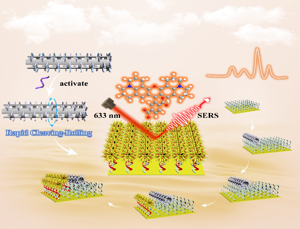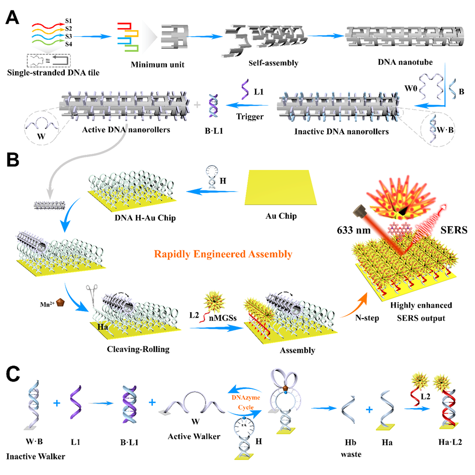 面对这些问题,beat365官方网站化学院周宏教授、何鹏副教授团队在Advanced Functional Materials (IF=18.5)发表了题为‘’High-Density Arrangement of Biomimetic Plasmonic Nanoprobes Guided by DNA Nanoroller based Cleaving-Rolling Process for SERS Sensing Analysis‘’的研究。受农业联合机械化的启发,团队构建了一种独特的剪切-滚动-组装集成纳米器件(CRAIN),用于多种生物分子的高性能检测。在设计中,引入 DNA 纳米管作为构建载体,以设计具有DNAzyme步行链的多取向DNA 纳米辊,从而有效增加反应取向和局域浓度。通过目标特异性识别,激活的纳米滚轮可以自主地沿着金基板上的发夹轨道进行循环地剪切和滚动,从而显著提高反应速率。此外,使用核酸编码的海胆形金银复合纳米球(nMGS)作为SERS增强探针,通过剪切-滚动过程介导的nMGS探针的受控组装促进了高密度热点域的形成,进一步改善了检测灵敏度。而且,作为一种智能化的通用平台,CRAIN系统可以扩展用于多种分析物的高灵敏度分析,例如microRNA-21、丁酰胆碱酯酶活性和有机磷农药等。该研究展示了DNA 纳米辊在生物传感领域的广泛应用潜力,这种集成化组装策略为临床诊断、生物医学工程和环境科学提供了新的研究视角。