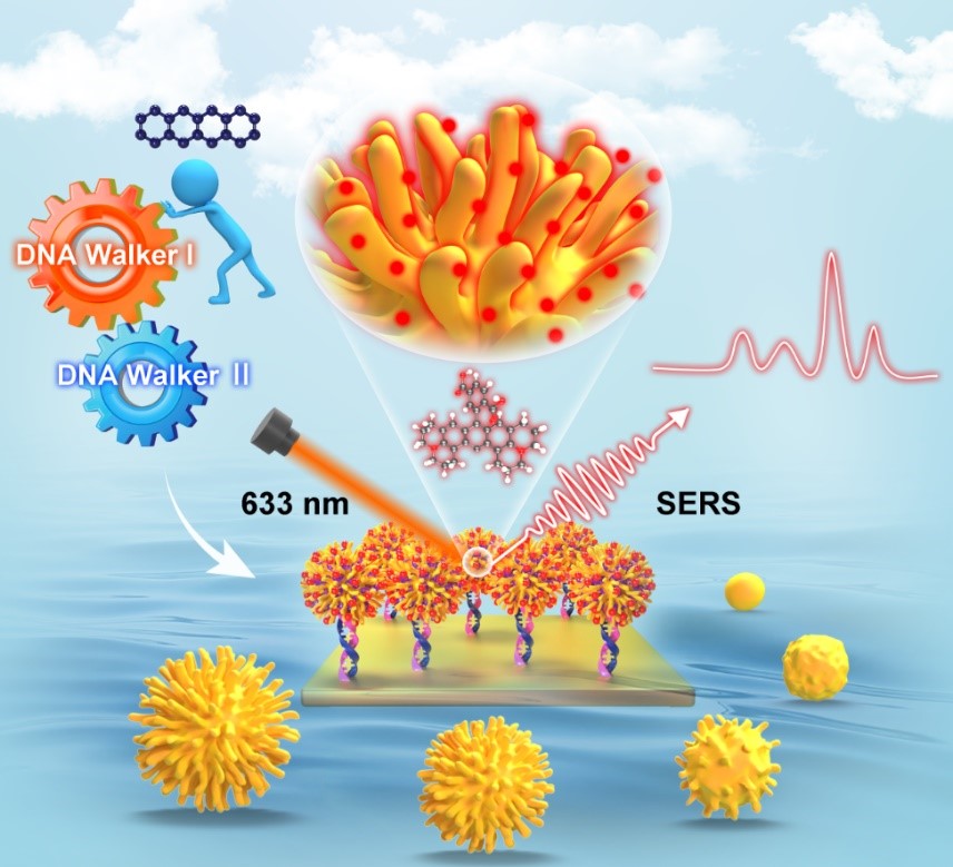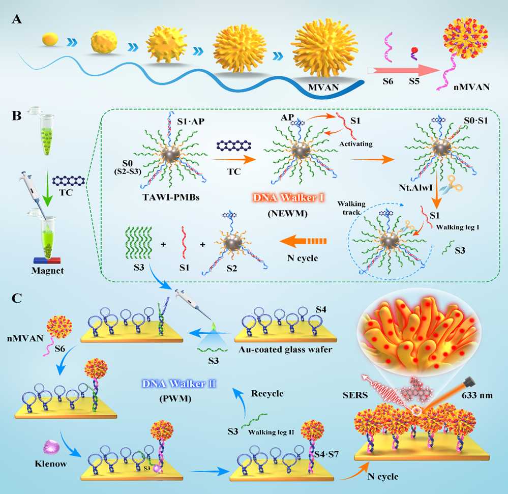 针对以上挑战,beat365官方网站化学院周宏教授团队、何鹏副教授在Small(IF=13)上发表了题为“Engineering Assembly of Plasmonic Virus-Like Gold SERS Nanoprobe Guided by Intelligent Dual-Machine Nanodevice for High-Performance Analysis of Tetracycline”的研究。该研究设计了一种新型的双机联动纳米器件(DMLD)。以挂锁适配体组件作为启动指挥中心,核酸编码的类病毒多刺突金纳米粒子(nMVANs)作为信号指示器,级联步行者电路作为处理器,实现了对TC的高性能分析。MVAN 中刺突顶点和刺突间纳米间隙的存在促进了强烈的电磁近场聚焦,为nMVAN的高SERS活性提供了保障。而且,通过多级Walker催化电路之间的顺序激活,DLMD系统能够将有限的TC识别转化为DNA扩增子引导的SERS探针的大规模工程化组装,从而实现全域等离子体热点的协同增强。高活性仿生探针和多机模块化设计的精巧结合这一构建理念凸显了智能纳米器件在分析环境和食品中的痕量危害物方面的巨大应用潜力。