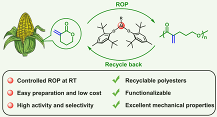 具有闭合循环生命周期的聚合物材料在使用生命结束后可以在特定条件下解聚成原始单体,简单纯化后可重新聚合得到高品质聚合物。发展可闭环回收聚合物是塑料污染问题的最佳解决方案之一。尽管如今可闭环回收聚合物已经取得了巨大进展,但关于含修饰官能团的可闭环回收聚合物的报道仍然有限。α-亚甲基-δ-戊内酯(MVL)作为一种生物基双功能单体,在制备具有侧基可修饰双键官能团的可闭环回收聚酯方面具有广阔的前景。然而,MVL的化学选择性开环聚合(ROP)仍然面临着聚合温度低、催化剂价格昂贵和催化剂负载量大的挑战。