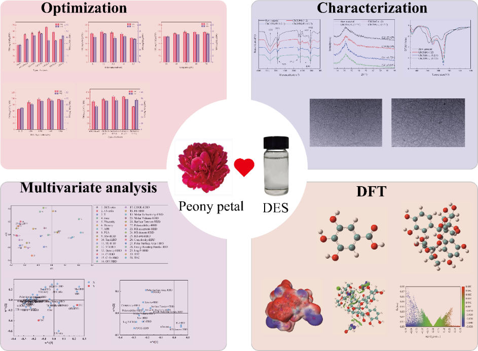 团队利用低共熔溶剂提取牡丹花瓣中酚类和黄酮类化合物,探究了八种不同类型的DES的提取效率。当氯化胆碱、乙二醇和尿素的摩尔比为1:2:2,含水量为30%时,总酚和总黄酮的提取量最高。通过多变量分析,建立了以提取量为目标的关系模型。其中,HBD的参数对总酚和总黄酮的提取量有显著影响。此外,采用量子化学计算以芦丁和没食子酸为目标分子,探究DES与目标分子的相互作用。结果表明,氢键是其中主要的相互作用力。相关研究成果以“Mechanism of deep eutectic solvents based extraction of phenolic and flavonoid compounds from peony petals”为题目,发表在知名国际期刊Industrial Crops & Products(SCI一区TOP期刊),论文DOI链接为doi.org/10.1016/j.indcrop.2024.119947。论文第一作者为化工学院2022级硕士研究生王胜林,通讯作者为徐环斐,beat365官方网站为第一单位和唯一通讯单位。