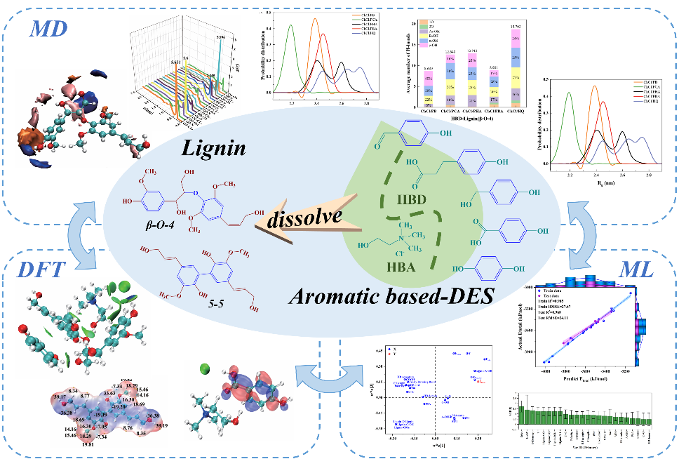 团队采用密度泛函计算、分子动力学模拟和多变量分析等方法,研究了5种芳香基DES与2种木质素二聚体模型的相互作用机理。探讨了溶解温度和芳香氢键给体类型对木质素β-O-4与5-5亚结构单元间连接键或与不同官能团相互作用的影响。在木质素溶解过程中,γ-OH是PB和Cl-作用于木质素二聚体(β-O-4)的首选位点,与γ-OH形成氢键的比例为40%。它分布在木质素二聚体(β-O-4)周围0.28 ~ 0.32 nm处,总相互作用能为-4041.1452 kJ/mol。相关研究成果以“Comprehensive analysis of lignin dimer dissolution microscopic mechanism in different aromatic-based deep eutectic solvent”为题目,发表在生物质化工研究领域国际知名期刊Industrial Crops & Products(SCI一区TOP期刊)。论文第一作者为化工学院2021级硕士研究生朱宝平和2022级硕士研究生葛瀚文,通讯作者为徐环斐,beat365官方网站为第一单位和唯一通讯单位。论文DOI链接为10.1016/j.indcrop.2024.119736。