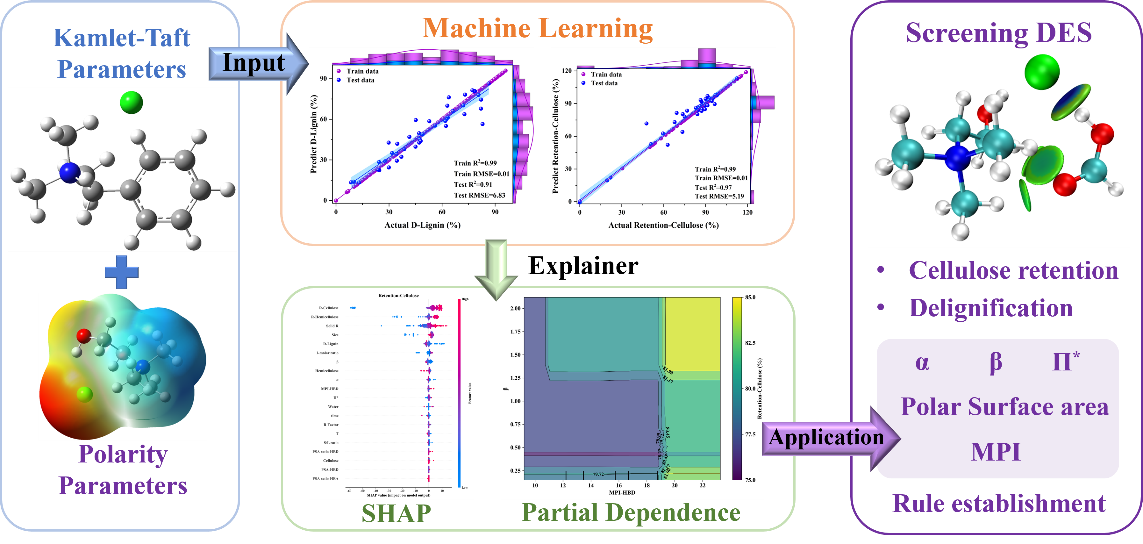 团队结合密度泛函理论和机器学习方法,利用104种低共熔溶剂(DES)的Kamlet-Taft参数和极性值建立了内在关系模型。通过氢键酸度(α)、氢键碱度(β)、极化(Π*)和分子极性指数(MPI)的协同组合,有望筛选出对花卉的根茎叶中纤维素、半纤维素、木质素处理效率高的DES。该模型给出了预处理效率高的参数范围。在本研究给出的4个参数范围内,可以选择DES的组成和比例,以确保至少保留80%的纤维素和去除50%的木质素。分子模拟结果表明,这些高效的DES通常含有大量的氢键和高极性基团。相关研究成果以“Explicable Machine Learning for Predicting High-Efficiency Lignocellulose Pretreatment Solvents Based on Kamlet–Taft and Polarity Parameters”为题目,发表在绿色化学研究领域国际知名期刊ACS Sustainable Chemistry & Engineering(SCI一区TOP期刊)。论文第一作者为化工学院2022级硕士研究生葛瀚文,通讯作者为徐环斐,beat365官方网站为第一单位和唯一通讯单位。论文DOI链接为10.1021/acssuschemeng.4c01563。