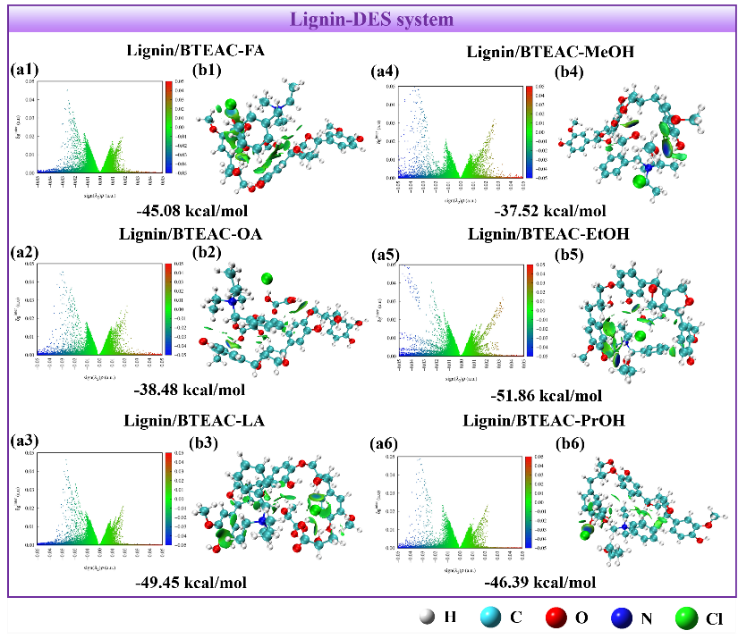 团队采用多尺度模拟分析方法研究了苄基三乙基氯化铵(BTEAC)基DES与木质素在分子水平上的相互作用机理。通过分析不同体系中的弱相互作用类型、电荷分布、氢键数、能量分布和密度分布,阐明了六种氢键供体结构对萃取过程的影响。其中,由于甲酸(FA)体积较小,为BTEA+与木质素的接触提供了更多的空间,从而产生更强的相互作用。为BTEAC-FA在预处理过程中去除木质素的效果提供了分子水平的理论基础。相关研究成果以“Microscopic mechanism investigation of extraction of lignin by benzyltriethylammonium chloride-based deep eutectic solvents”为题目,发表在生物质化工研究领域国际知名期刊Journal of Molecular Liquids(SCI一区TOP期刊)。论文第一作者为化工学院2022级硕士研究生葛瀚文,通讯作者为徐环斐,beat365官方网站为第一单位和唯一通讯单位。论文DOI链接为10.1016/j.molliq.2024.125996。