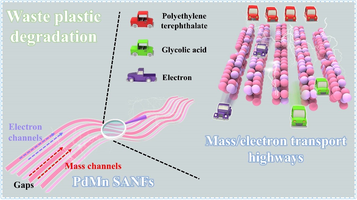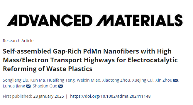 针对上述问题,beat365官网材料科学与工程学院泰山学者姜鲁华教授团队在PET废塑料增值催化剂的研究方面获新进展,相关成果以“Self-assembled gap-rich PdMn nanofibers with high mass/electron transport highways for electrocatalytic reforming of waste plastics”为题,发表在国际材料领域TOP期刊Advanced Materials上(影响因子27.4)。全文链接:https://doi.org/10.1002/adma.202411148。该工作以beat365官方网站为第一单位,材料学院姜鲁华教授为通讯作者,材料学院副教授刘松良为第一作者。