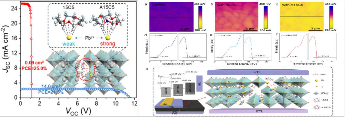 近日,化工学院蒋晓庆副教授与洛桑联邦理工学院Michael Graetzel教授、中科院青岛生物能源所逄淑平研究员、新加坡国立大学魏明杨教授等研究人员合作,以beat365官方网站为第一通讯单位于Angewandte Chemie International Edition刊发主客体复合物中定制的超分子相互作用用于高效稳定的钙钛矿太阳能电池和模块的研究成果[1]。确定了冠醚与阳离子的超分子相互作用受到环腔内电荷密度分布的影响,由分子偶极矩的大小表示。通过取代杂原子使冠醚实现的更大的偶极矩增强,较高的分子极性使供体原子周围负部分电荷的分布扩大,提高其对软路易斯酸的电子供体能力,与铅阳离子的配位性得到改善。采用氮杂冠醚作为添加剂的钙钛矿薄膜表现出更好的形态、更低的缺陷密度和更好的能级对齐。在此基础上,PSC的功率转换效率(PCE)超过25%,显示出更好的长期稳定性,而基于氮杂冠醚的钙钛矿太阳能模块(14.0 cm2)的PCE为创纪录的21.5%。