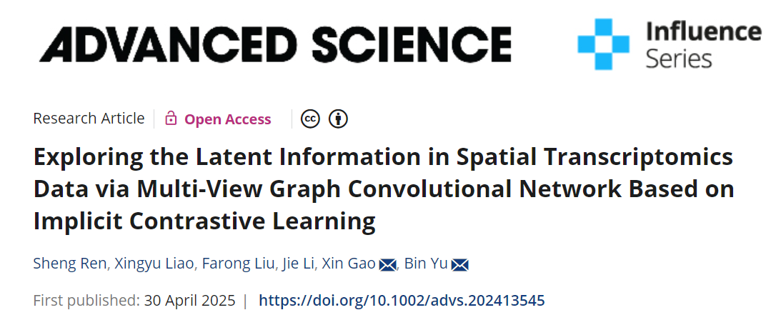 Sheng Ren, Xingyu Liao, Farong Liu, Jie Li, Xin Gao*, Bin Yu*. Exploring the Latent Information in Spatial Transcriptomics Data via Multi-View Graph Convolutional Network Based on Implicit Contrastive Learning. Advanced Science, 2025, 2413545.