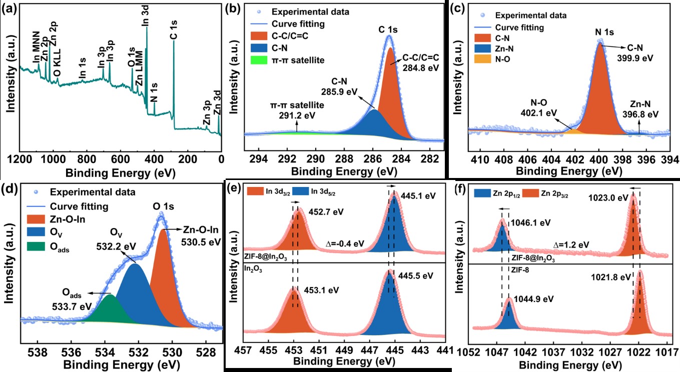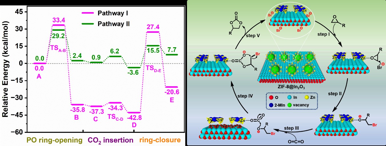 在ZIF-8生长过程中,Zn2+与In3+离子竞争性配位2-甲基咪唑配体,这种竞争导致ZIF-8的配位微环境发生改变,即部分配体氮原子与In3+形成弱配位,同时部分Zn2+与In2O3表面的氧原子配位。电子转移:XPS分析证实,电子从ZIF-8中富电子的氮原子向In3+转移,增强了Zn2+位点的路易斯酸性(利于活化环氧烷烃);同时,材料整体的路易斯碱性也得到提升(利于吸附活化CO2,CO2-TPD证实)。协同增效:这种界面相互作用创造性地同时强化了材料的酸性(活化环氧烷烃)和碱性(活化CO2)位点,克服了单一材料性能的局限。