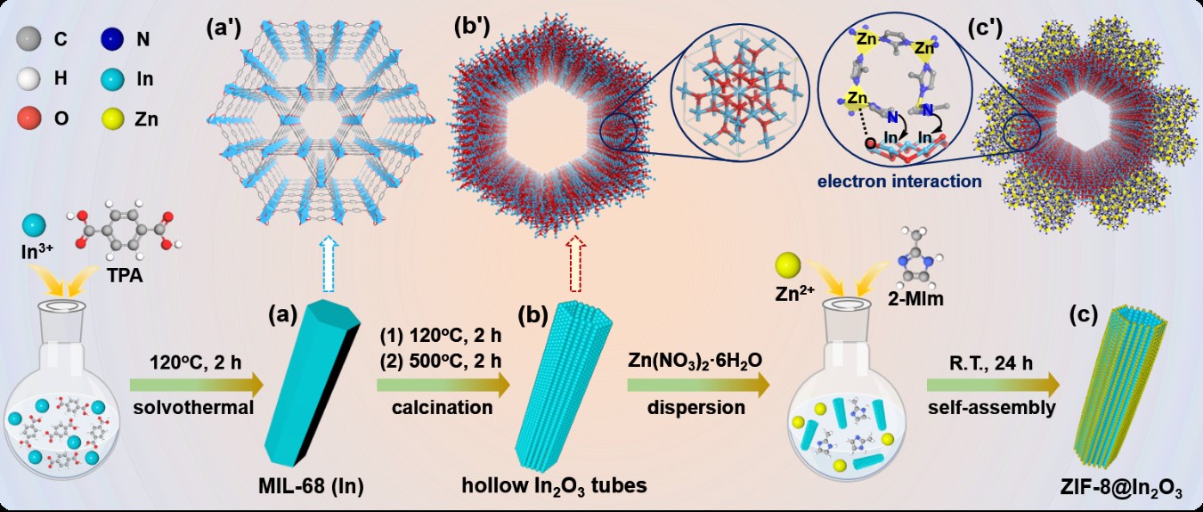 坚固内核:以热稳定性优异的中空In2O3管作为支撑内核,提供机械稳定性;活性外壳:在In2O3表面原位生长沸石咪唑酯骨架材料ZIF-8(由Zn2+与2-甲基咪唑配位形成)形成外壳,提供丰富的孔结构和活性位点。中空优势:独特的中空结构赋予材料高比表面积,利于反应物富集与传质。