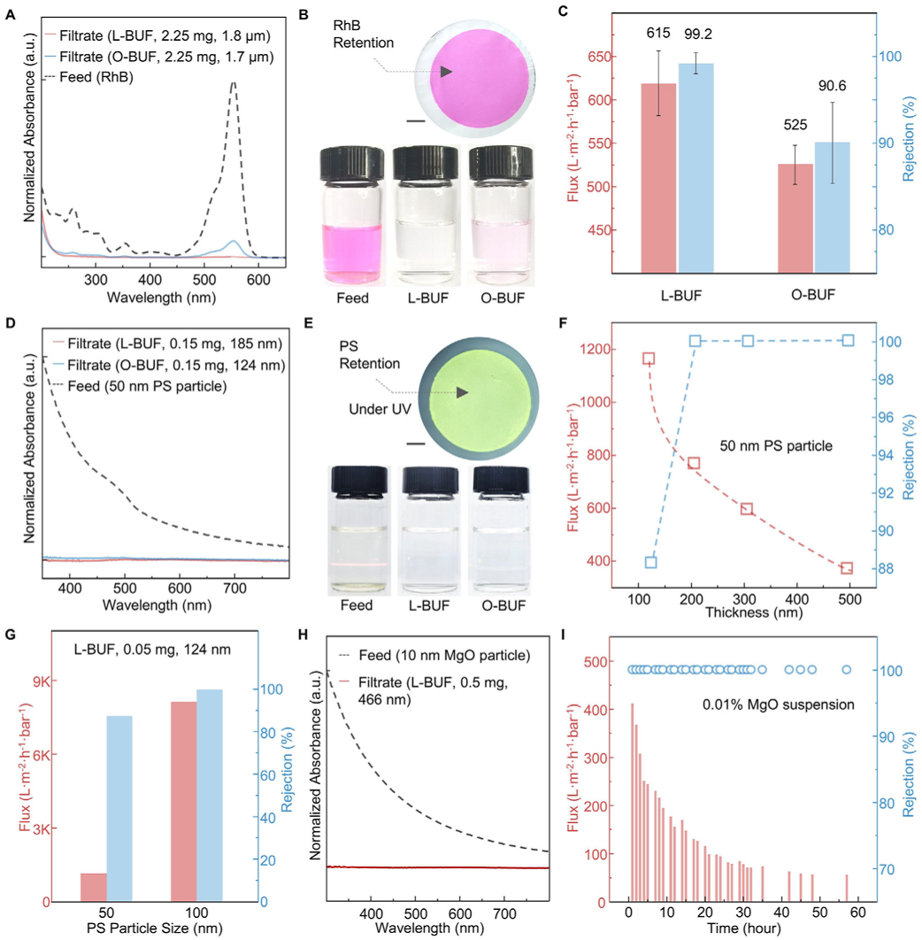 图4:BUF 用于水净化的过滤性能。A–C) 具有 2.25 mg ChNF 膜的 BUFs 的罗丹明 B (RhB) 进料溶液和滤液的 UV-Visible 光谱 A);显示 RhB 在 L-BUF 上的截留、进料溶液和相应滤液的照片 (B; 比例尺, 1 cm);BUFs 的通量和截留性能 C)。D–F) 具有 0.15 mg ChNF 膜的 BUFs 的 50 nm 聚苯乙烯 (PS) 颗粒进料悬浮液和滤液的 UV-Visible 光谱 D);L-BUF 上 RhB 截留、进料悬浮液和滤液的照片 (E; 比例尺, 1 cm);L-BUF 的通量和截留性能 F)。G) 具有 0.05 mg ChNF 的 L-BUF 对 50 nm 和 100 nm PS 悬浮液的过滤性能。H) 具有 0.5 mg ChNF 膜的 BUFs 的 10 nm MgO 颗粒进料悬浮液和滤液的 UV-Visible 光谱。I) L-BUF 对 0.01% 10 nm MgO 悬浮液的长期通量和截留性能。