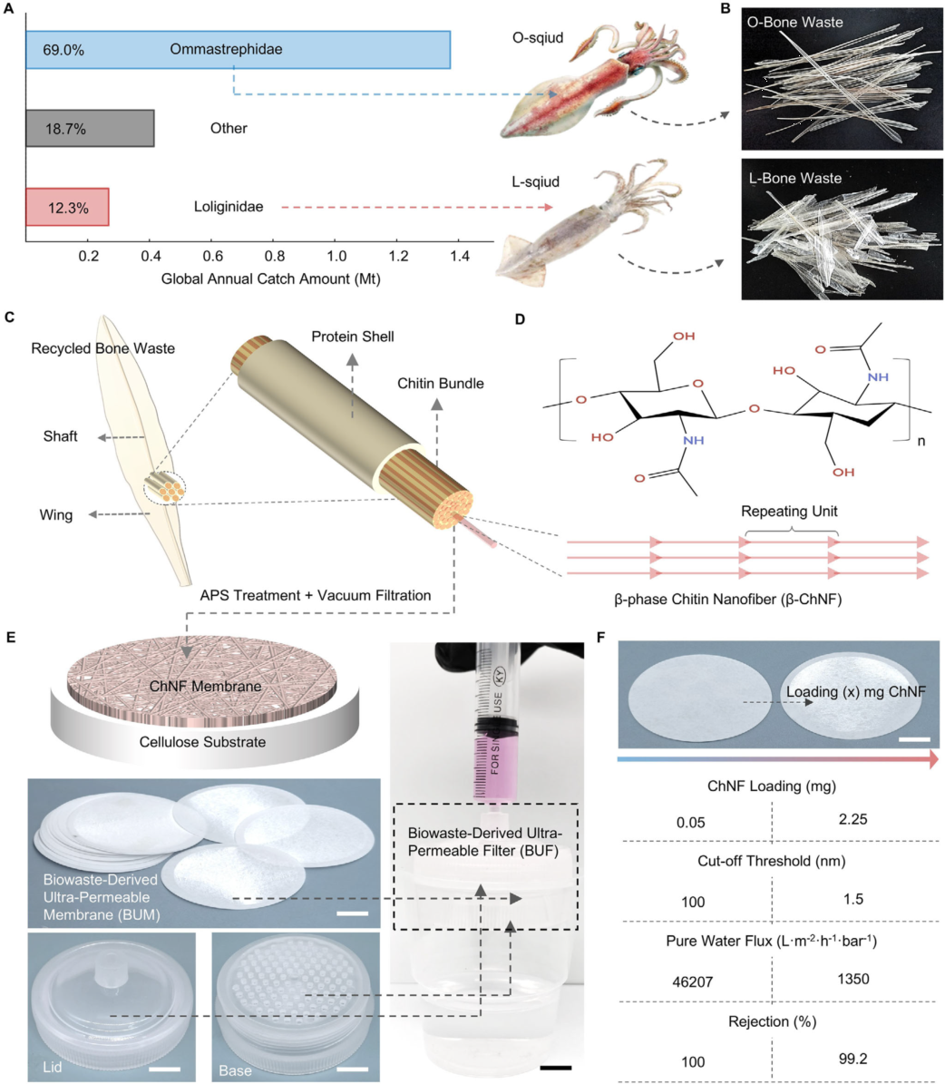 图1:从鱿鱼骨生物废物到过滤系统的路径。A) 全球鱿鱼年捕获重量。B) L-鱿鱼和O-鱿鱼及其相应骨骼的照片。C) β-相几丁质纳米纤维(β-ChNF)与骨骼之间关系的示意图。D) β-ChNF的化学结构。E) 生物废物来源的超渗透过滤器(BUF)的示意图和照片,以及相应的注射器装置(比例尺,1 cm)。F) 不同ChNF负载质量的BUM性能(比例尺,1 cm)。
