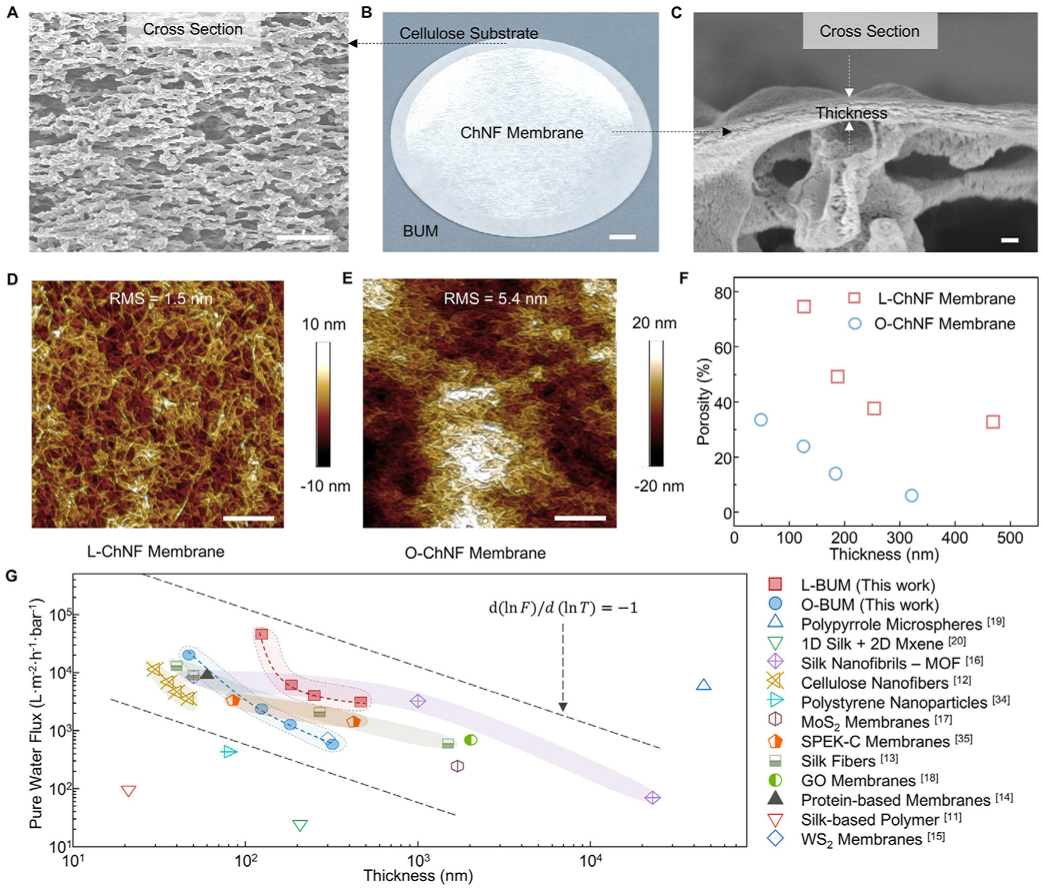图3:由 ChNF 构建块构建的 BUM 的结构和水通量。A–C) 纤维素支撑体的横截面 SEM 图像 (A; 比例尺, 10 μm);由纤维素支撑体和 ChNF 膜组装的 BUM 的照片 (B; 比例尺, 0.5 cm);ChNF 膜的横截面 SEM 图像 (C; 比例尺, 100 nm)。D,E) L-ChNF 膜 D) 和 O-ChNF 膜 E) 的 AFM 图像 (比例尺, 200 nm)。F) L-ChNF 和 O-ChNF 膜的厚度和孔隙率之间的关系。G) 本工作中的 BUFs 与其他报道的薄过滤器的纯水通量比较。