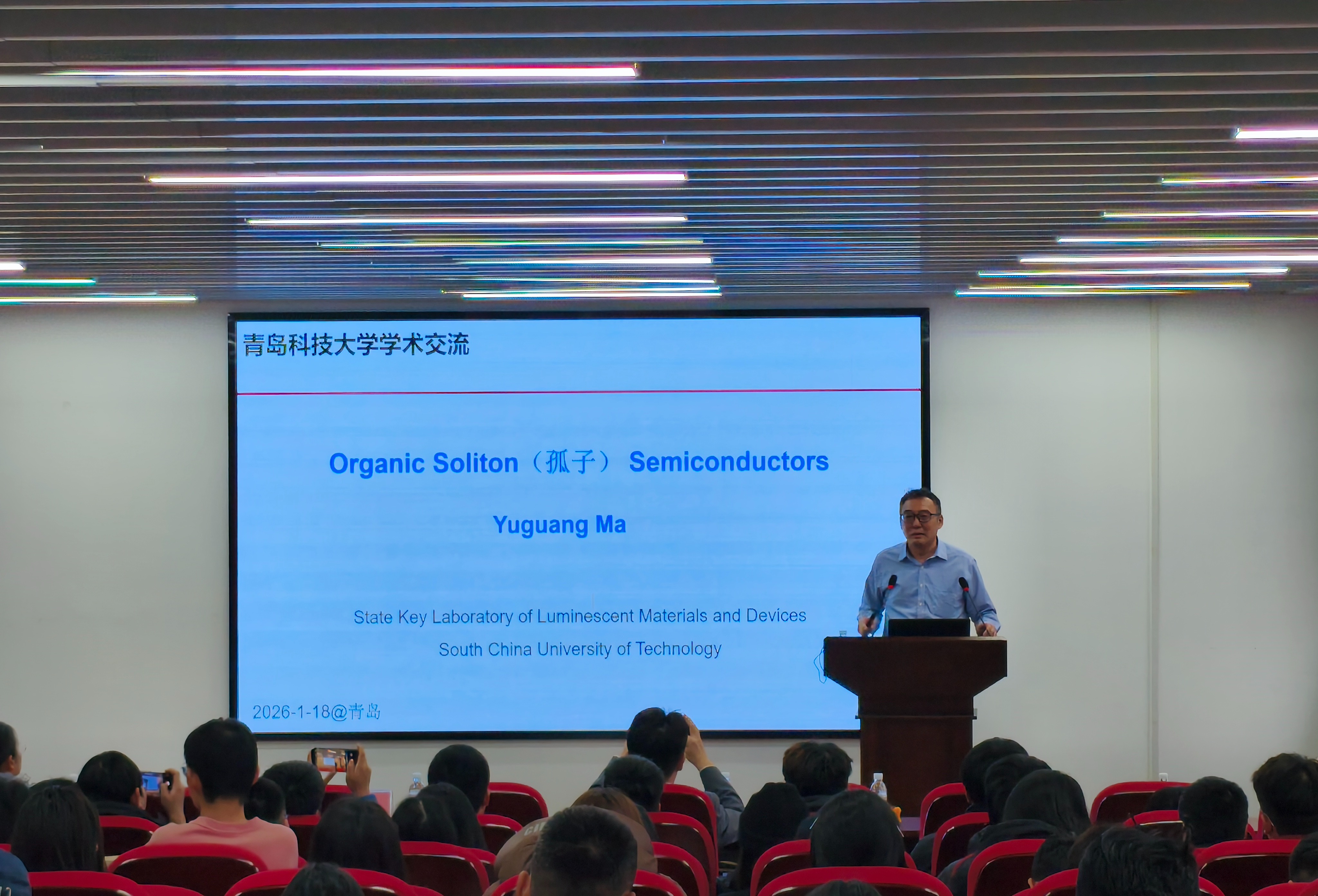 马於光院士的报告紧扣OLED行业核心技术难题,围绕有机孤子半导体主题,系统阐述有机高分子光电材料的新机制与新结构,深入解析材料“化学-聚集态-电子”多级结构与性能的内在关联。马於光结合团队科研实践,分享了高性能发光材料研发的关键突破与原创成果,为OLED材料产业高质量发展提供了精准学术指引,也为在场师生搭建起前沿理论与产业应用的沟通桥梁。