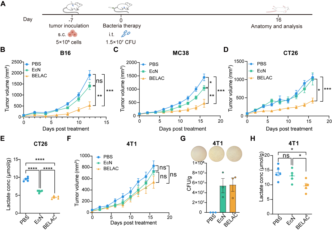 基于这一发现,研究团队推测:如果增强EcN的乳酸代谢能力,是否能大幅提升其疗效?团队采用基因组整合策略,将强化后的乳酸代谢基因盒稳定整合到EcN染色体中,成功构建了一株无质粒、基因组稳定、具有超强乳酸代谢能力的工程菌株,命名为BELAC(Bacteria with Enhanced LActate Consumption)。在B16、MC38和CT26等多种小鼠同源肿瘤模型中,BELAC展现出优异的抗肿瘤效果和安全性。值得注意的是,研究也客观指出,在免疫原性极低的“冷”肿瘤(如4T1乳腺癌)模型中,单靠清除乳酸尚不足以完全抑制肿瘤,这提示未来可将BELAC与免疫检查点抑制剂等疗法联用,以攻克更难治的肿瘤类型。