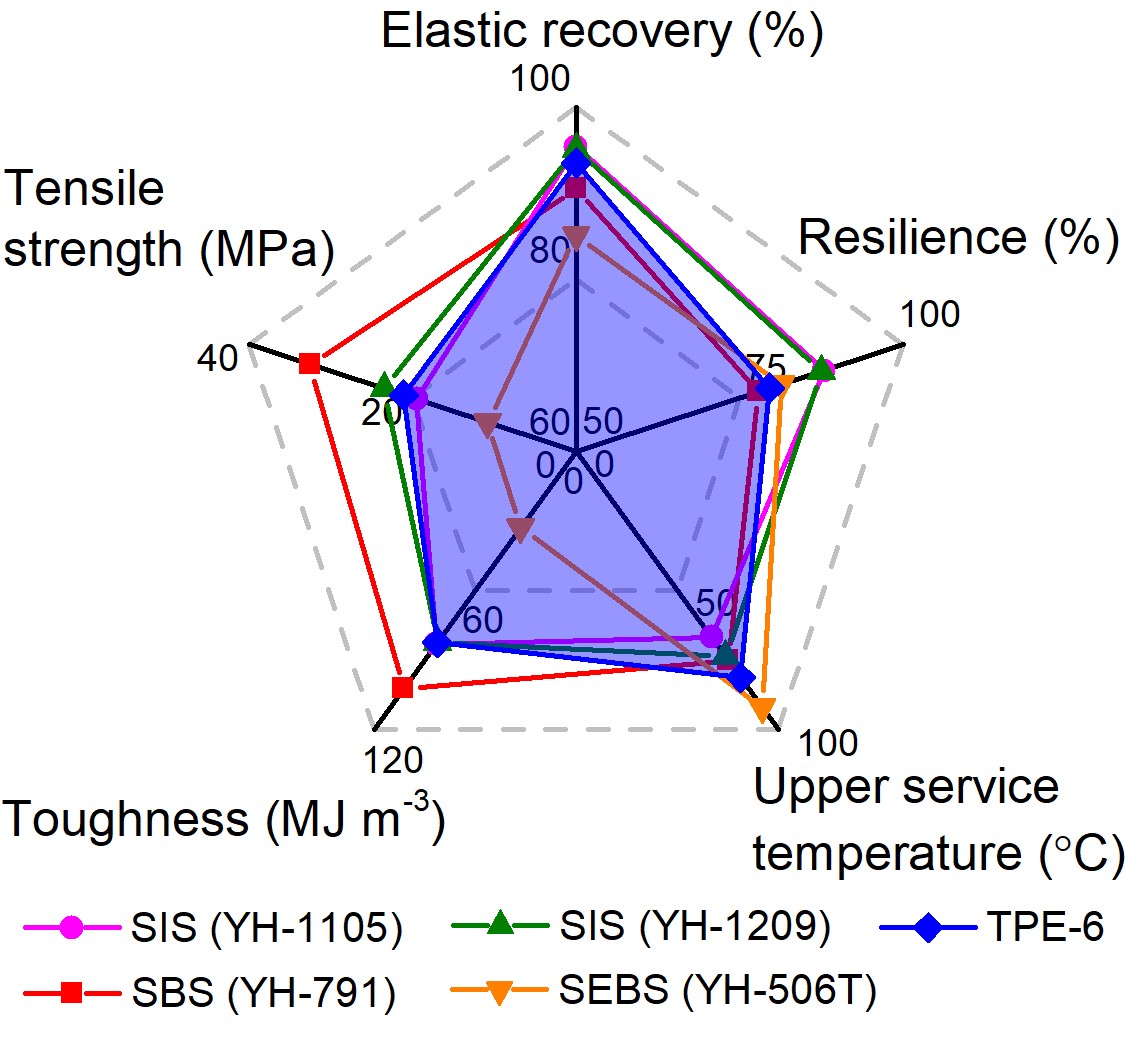 图1TPE‑6与巴陵石化公司生产的SBS(YH-791)、SIS(YH-1105)、SIS(YH-1209)及SEBS(YH-506T)的性能比较