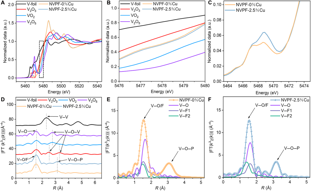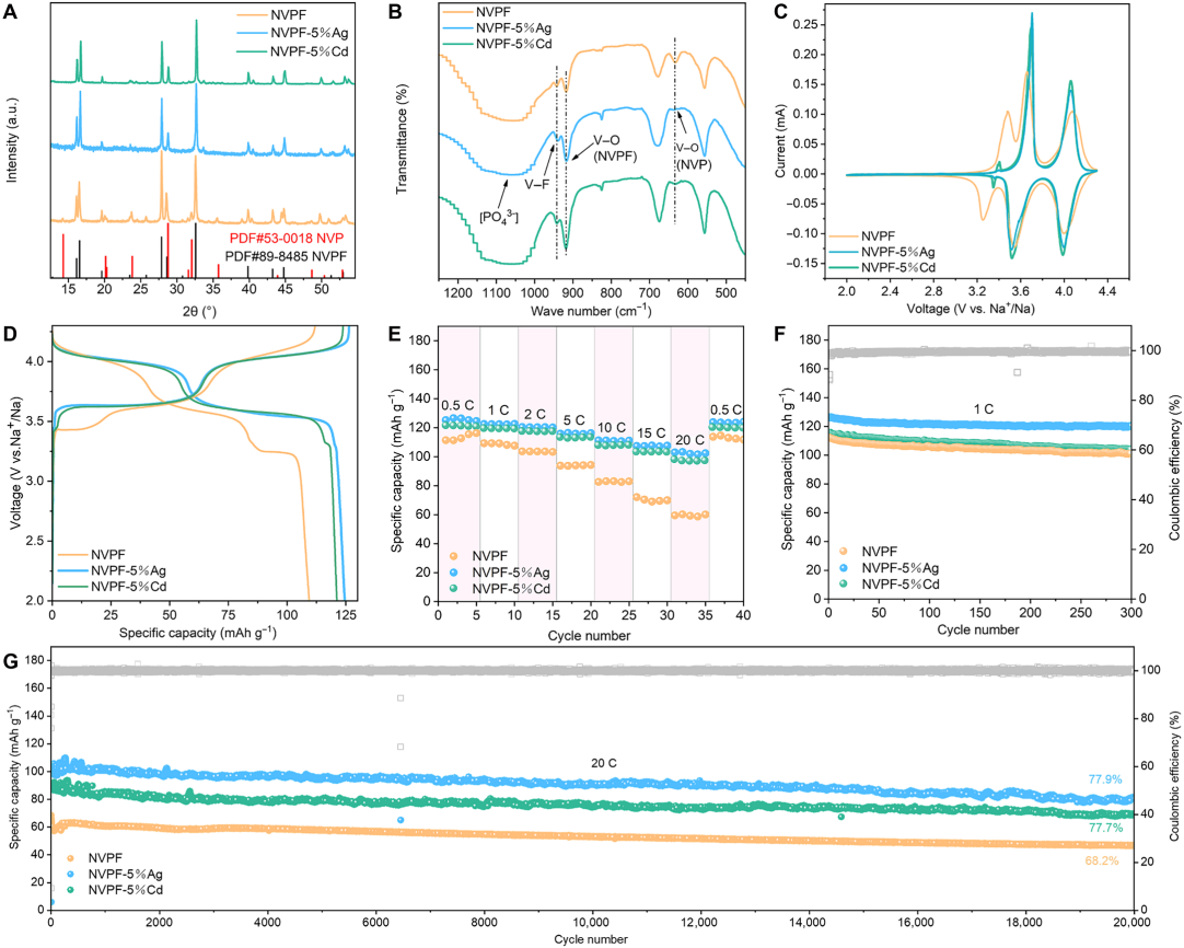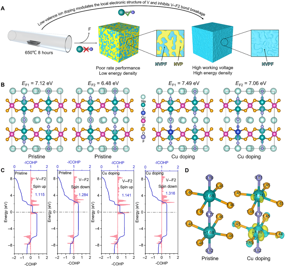 为此,刘治明教授团队联合香港城市大学楼雄文教授提出了一种通过引入低价金属阳离子调控NVPF中V的局部配位环境的通用策略以解决上述问题。基于电荷补偿机制,低价金属阳离子的引入使部分V3+转变为V4+,高价V增强了对F2的吸引力,缩短了悬垂V─F2键的键长,实现氟稳定化,有效抑制氟流失和NVP杂相生成;通过密度泛函理论和同步辐射等表征手段揭示了氟稳定化的内在机制。实验结果表明,掺杂2.5%Cu的NVPF具有更高的工作电压(3.69 V)以及更优异的循环稳定性:在20 C下循环10000圈后容量保持率仍达83.3%。所组装的NVPF-2.5%Cu//硬碳全电池展现出优异的倍率与循环性能,在0.5 C下能量密度高达456.1 Wh kg⁻1,优于多数已报道的磷酸盐基正极。同时,低价Cd2+、Ag+掺杂同样可有效抑制氟流失,证明该调控V的局域电子结构策略具有普适性,对推动NVPF实用化具有重要意义。