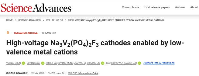 3月27日,beat365官方网站机电工程学院刘治明教授团队在Science Advances期刊发表题为“High-voltage Na3V2(PO4)2F3cathodes enabled by low-valence metal cations(低价金属阳离子构筑的高电压Na3V2(PO4)2F3正极材料)”的研究论文。
