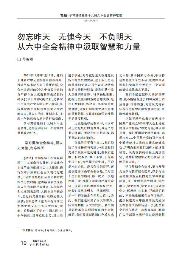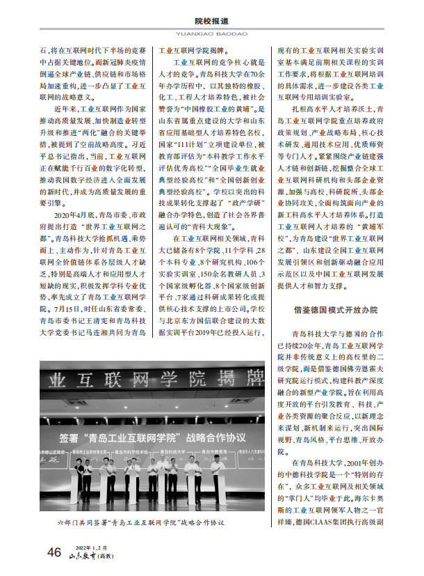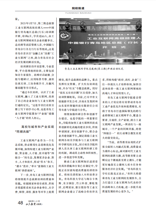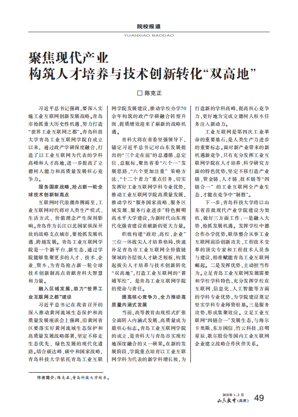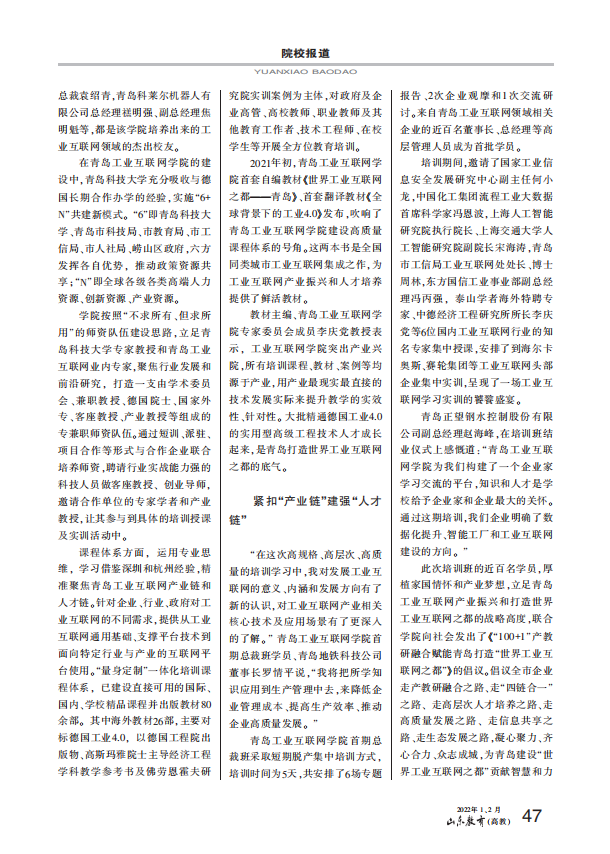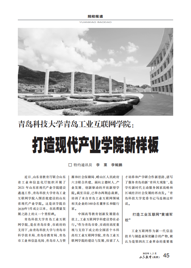 日前,《山东教育》(高教)2022年1、2月合刊刊发学校党委书记马连湘署名文章《勿忘昨天 无愧今天 不负明天 从六中全会精神中汲取智慧和力量》、校长陈克正署名文章《聚焦现代产业 构筑人才培养与技术创新转化“双高地”》。在“院校报道”版块以《beat365官方网站青岛工业互联网学院:打造现代产业学院新样板》为题,详细报道青岛工业互联网学院创建成效。