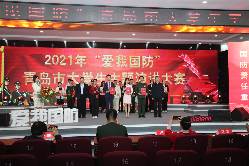 在庆祝中国共产党成立100周年之际,为进一步激发大学生崇军尚武、参军报国热情,10月26日,2021年“爱我国防”青岛市大学生主题演讲大赛在学校崂山校区第二报告厅举行。中共青岛市委网信办副主任张升强,中共青岛市委宣传部宣教处处长、一级调研员徐建民,青岛市教育局一级调研员李一鸥,青岛市广播电视台副总编辑颜涛,青岛警备区动员处处长、上校陈兵,中共崂山区委宣传部副部长胡声锐,学校党委常委、副校长丁林出席活动。在青相关高校党委宣传部、武装部负责人及学校师生代表参加活动。