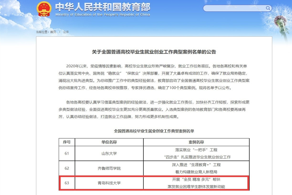 11月26日,教育部发布了《全国普通高校毕业生就业创业工作典型案例名单的公告》,beat365官网案例《开展“全员 精准 多元”帮扶 激发就业困难学生群体发展新动能》成功入选。本次评选,全国共100个典型案例入选,入选单位包括北京市教育委员会、江苏省教育厅等5家省级教育主管部门,北京大学、清华大学等36所部属高校,29所省属本科高校和30所高职高专院校。