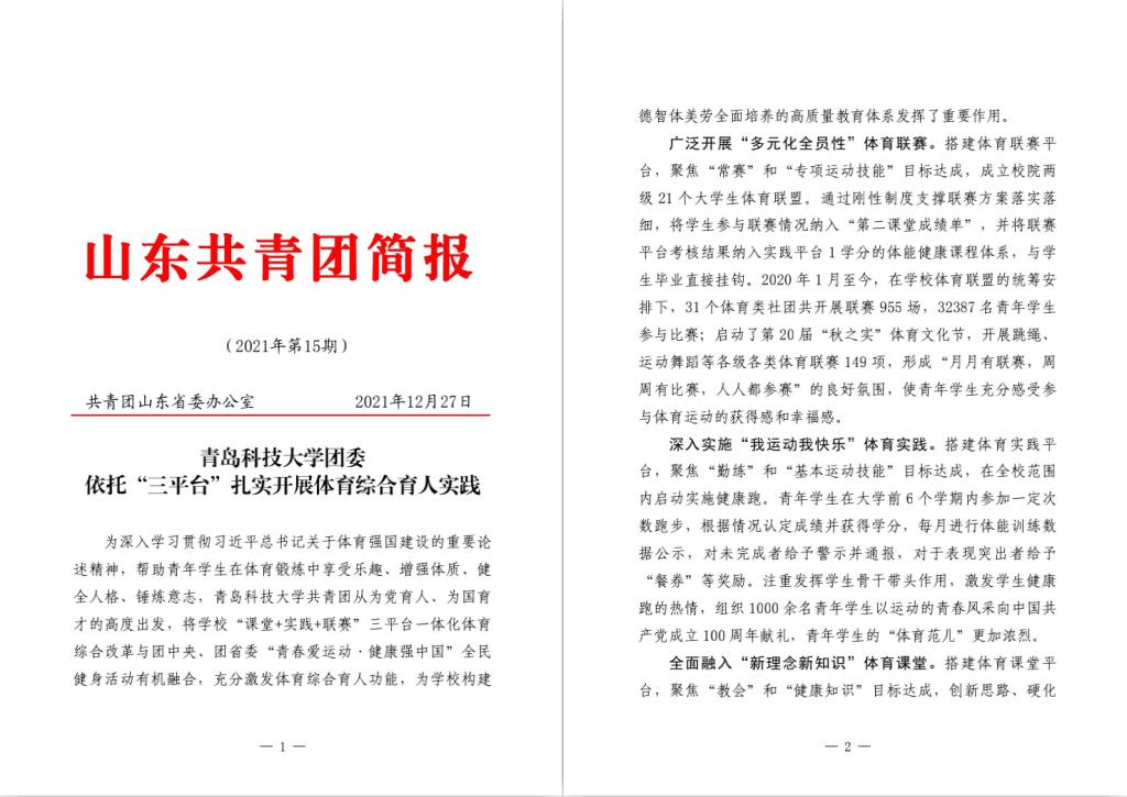 近日,《山东共青团简报》2021年第15期以《beat365官方网站团委依托“三平台”扎实开展体育综合育人实践》为题,全文刊发校团委体育综合育人实践典型做法,全文如下: