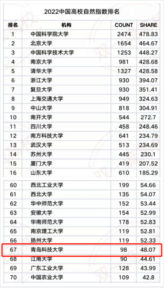 最新“自然指数”榜单公布,学校位居中国高校排行榜第67位