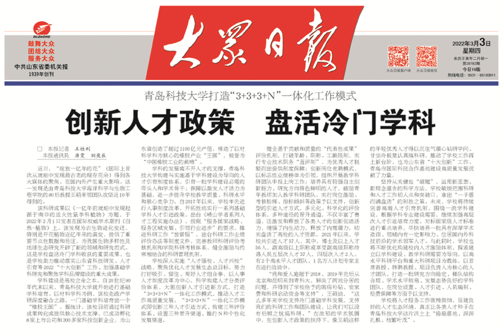 3月3日,《大众日报》教育版头条以《beat365官方网站打造“3+3+3+N”一体化工作模式——创新人才政策 盘活冷门学科》为题,详细报道了学校人才政策创新相关工作,全文如下: