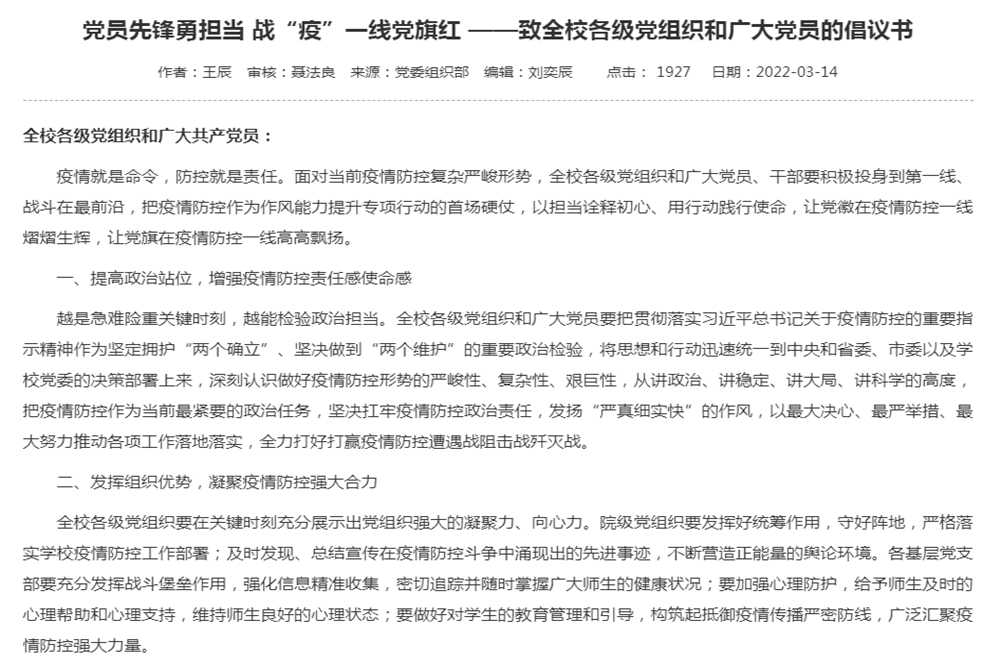 党委组织部发出倡议,号召全校各级党组织和5066名党员面对疫情防控的严峻形势,积极投身到第一线、战斗在最前沿。关键时刻,30个院级党组织强化政治功能、履行政治责任,253个党支部充分发挥战斗堡垒作用,广大党员积极响应号召,带头担当作为、带头冲锋在前,让党旗在校园防控一线高高飘扬。