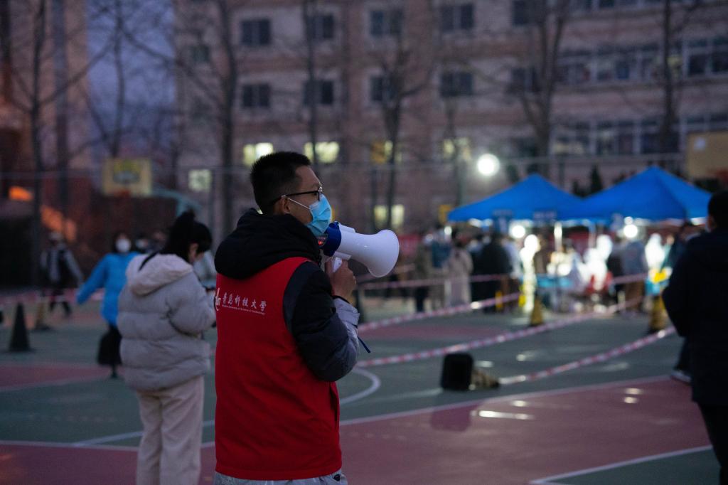 志愿者被分为秩序维护组、检测引导组、信息录入组,两校区每天300人不间断参与服务。机电学院学生王德鹤负责信息的录入和试管标签的粘贴,早晨5点便起床来到操场开始准备工作,厚重的防护服穿脱困难,他便坚持中途少休息。这项工作对耐心和细心要求极高,核酸检测中容不得半点疏忽,时刻紧绷的精神下,他主动顺延三个轮班期,连续工作6小时。脱下密闭的防护服,看着发白的手,王德鹤说:“防护服里除了被汗水湿透的衣服,还有作为青年志愿者火热的心,我们要用实际行动证明,我们已经成长为党和人民可以放心的青年一代”。面对突如其来的疫情,无数学生挺身而出,积极加入到志愿者队伍中。传媒学院学生刘晓阳感慨道:“我特别感动,我觉得这就是志愿服务的奉献精神,这就是我们的科大精神。”当被问到是否需要换班休息一下时,已经维持场内秩序一上午的志愿者果断地摇摇头,坚决地说:“不用,我能坚持。”语罢便跑去引导下一组待测人员,他们全力呼喊着,提醒大家保持一米间隔,寒风下冻僵的双手依旧高举挥舞,略有嘶哑的声音传递着爱和关心。青年志愿者的他们,特别能吃苦、特别能战斗、特别能奉献。