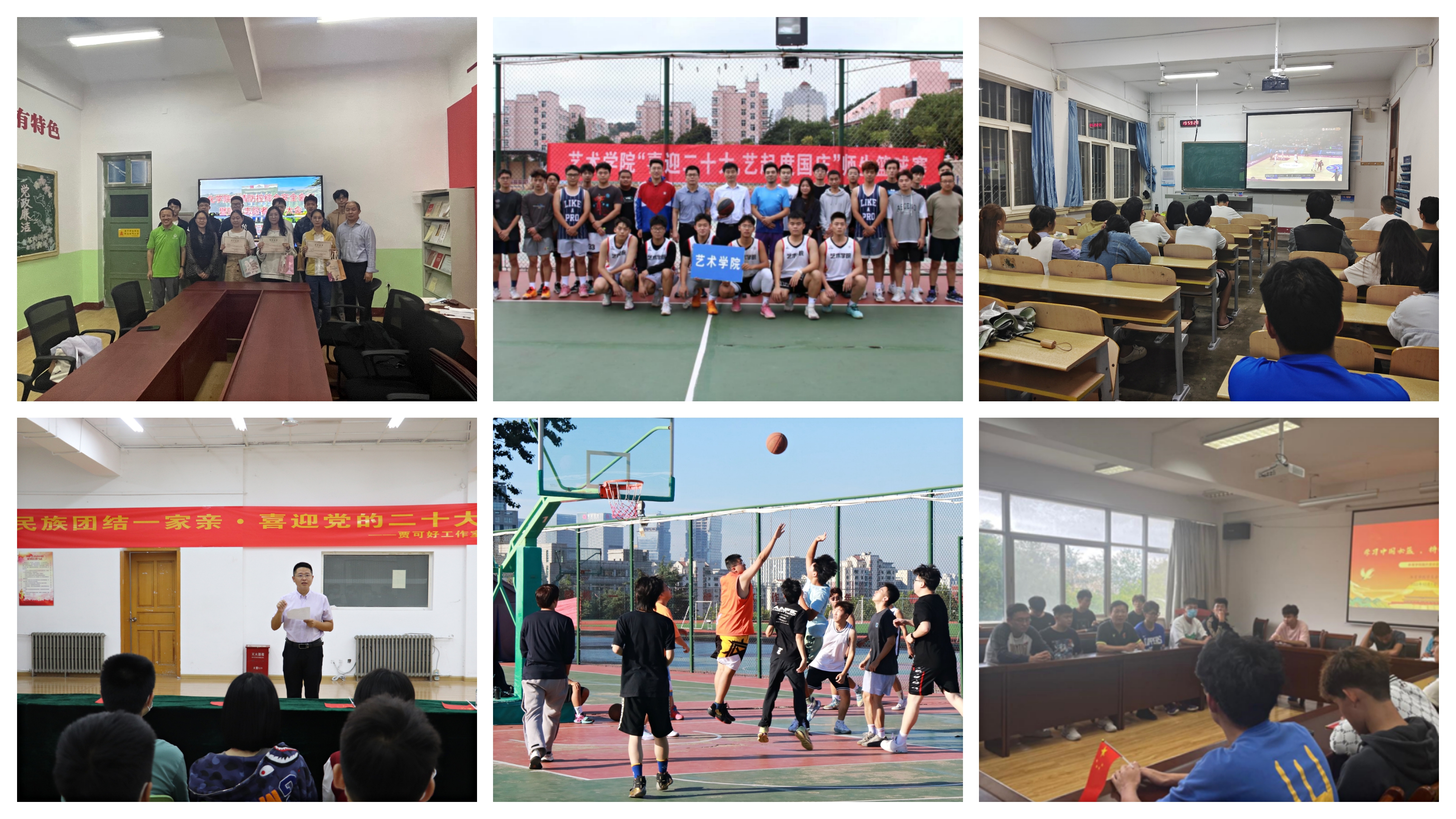 艺术学院开展“青春心向党·艺起度国庆”系列活动。举办师生篮球赛,学生处副处长徐华与学院师生共同参加,上好新生第一堂“体育思政课”;学院党政领导、导师、班主任和辅导员走访学生宿舍,加强人文关怀;开展“奔跑吧艺术”接力跑比赛、《建国大业》集体观影、党史团史书籍阅读会、国庆海报设计征集等活动,引导师生坚定理想信念,强化爱国荣校意识,以实际行动迎接党的二十大胜利召开。