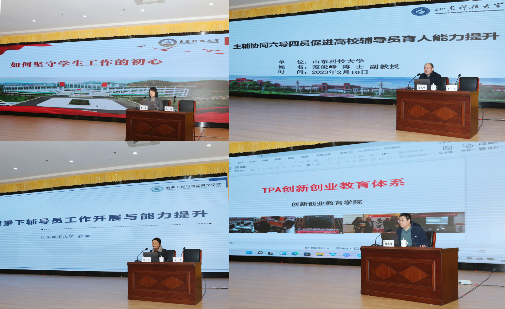 在专题报告环节,秦姣以《如何坚守学生工作初心》为题,从个人工作的“精诚实度”和团队工作的“精诚团结、相互协作”两个方面,配合生动翔实的案例,讲授了辅导员工作经验与实践感悟;2022年全国“最美高校辅导员”、山东科技大学范俊峰副教授以《主辅协同六导四员促进高校辅导员育人能力提升》为题,从辅导员的角色定位、自身贡献、工作方法和发展路径四个方面传授了经验与技巧;2022年全国“高校辅导员年度人物”、山东理工大学张佳副教授以《新时代背景下辅导员工作开展与能力提升》为题,从辅导员工作的变化与特点、工作开展和能力提升三个方面,讲授了育人理念和方法路径,为辅导员专业化职业化发展理清了思路、明晰了路径。
