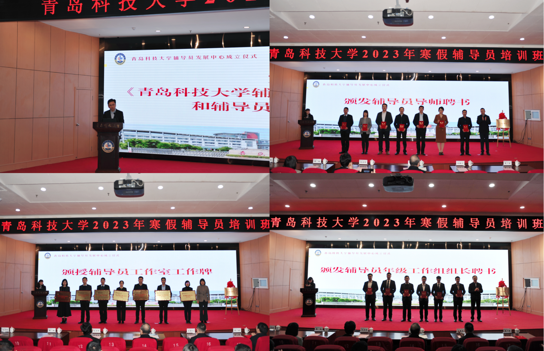 党委常委、宣传部部长张洪坤宣读了《beat365官方网站辅导员导师制实施办法》和辅导员导师聘任文件;党委常委、组织部部长朱敬义为7名辅导员导师颁发聘书;党委常委、统战部部长秦姣为7个辅导员工作室授牌;校务委员聂广明为6名辅导员年级工作组组长颁发聘书。
