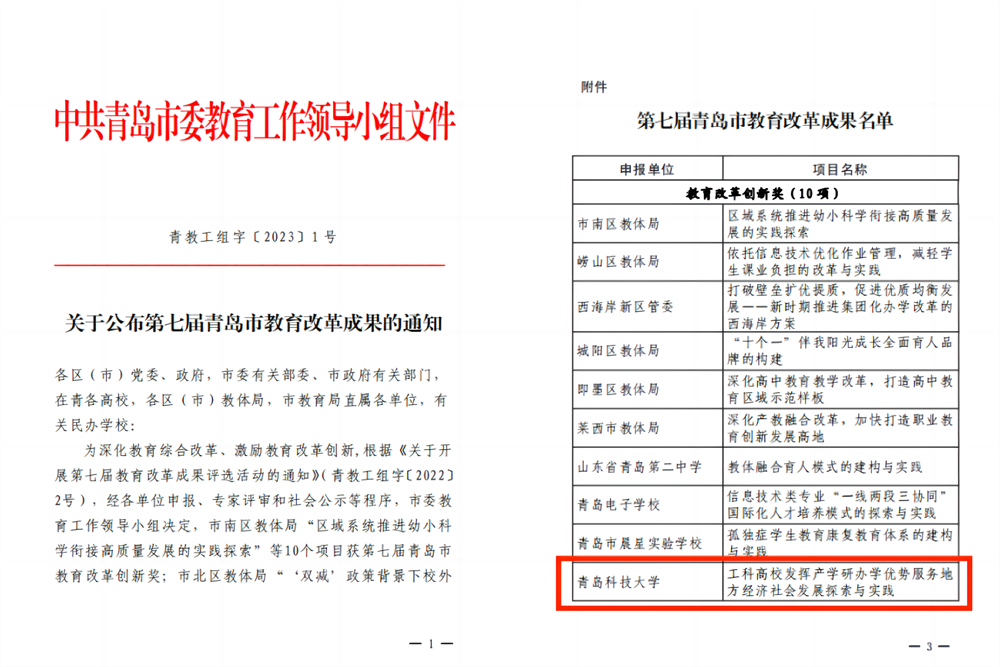 近日,第七届青岛市教育改革成果评选结果公布,由学校研究室(高等教育研究所)总结提报的成果《工科高校发挥产学研办学优势服务地方经济社会发展探索与实践》获评第七届青岛市教育改革创新奖,这是驻青高校唯一获奖成果,也是beat365官网首次获评青岛市教育改革成果。